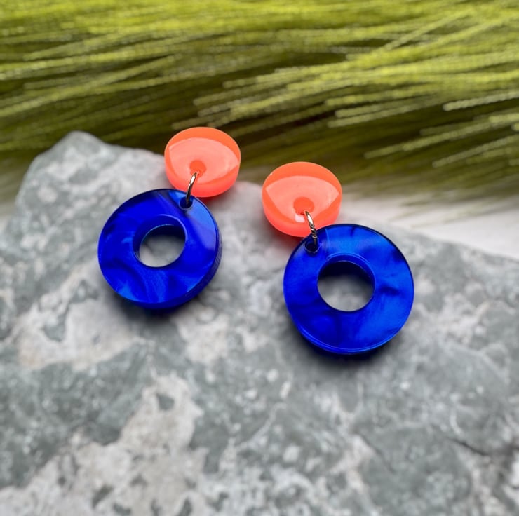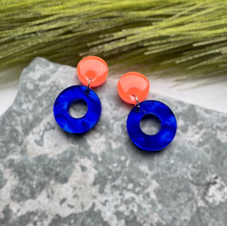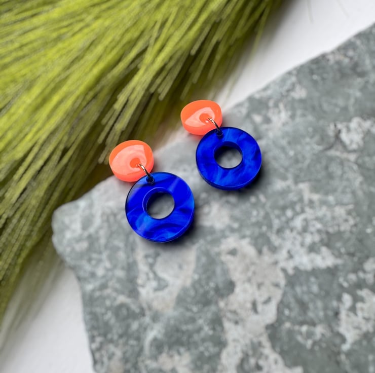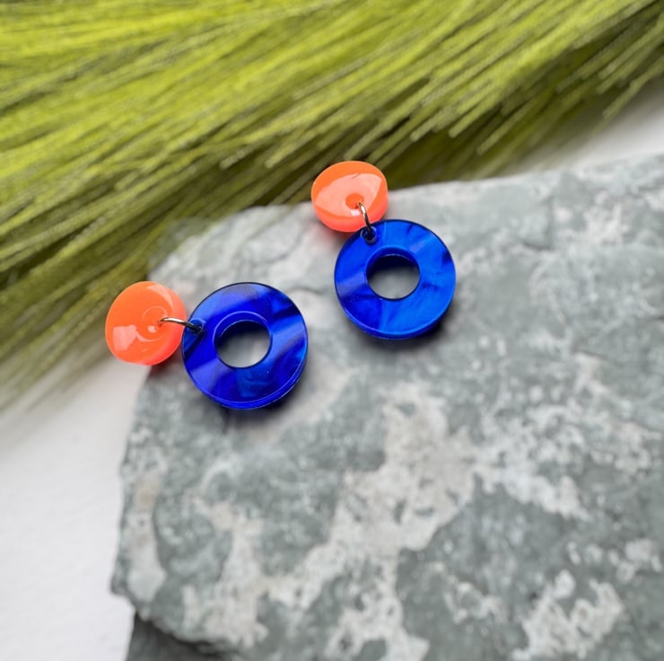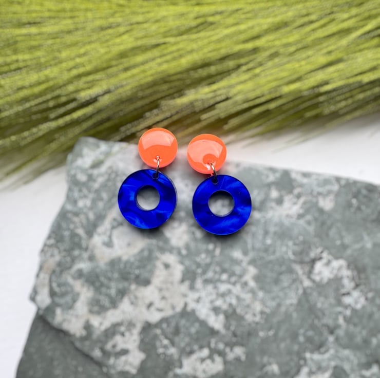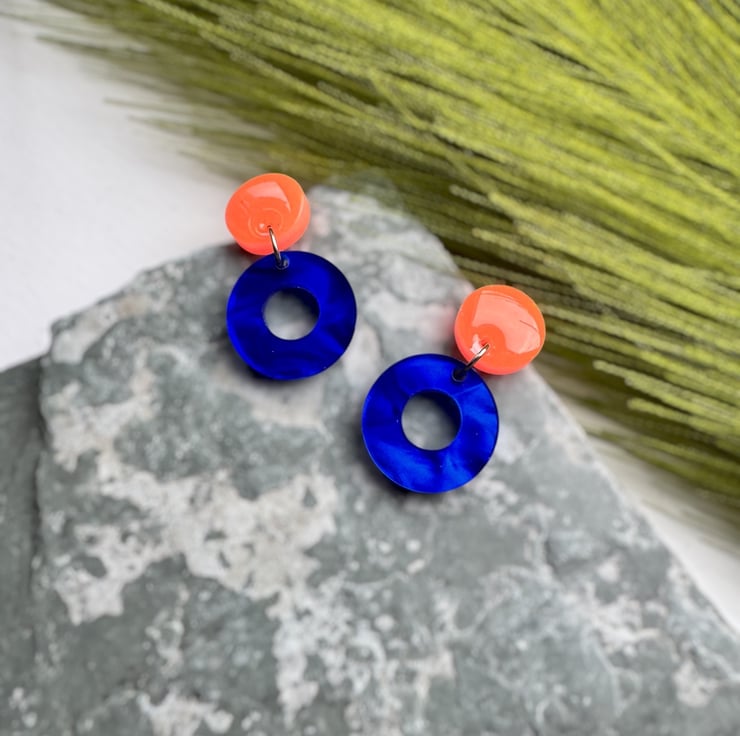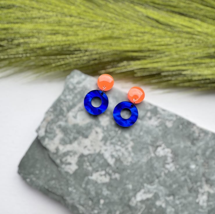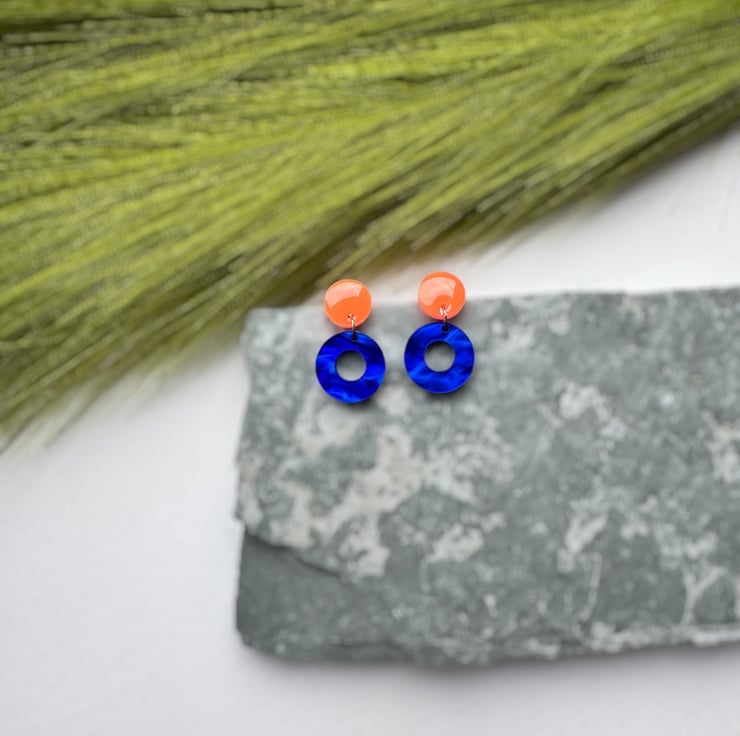 Circle stud top in Neon Orange and Deep Marble swirled Blue Circle hoops.