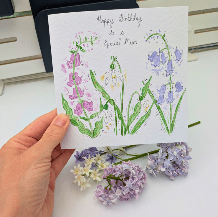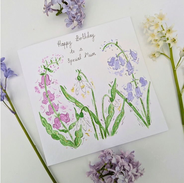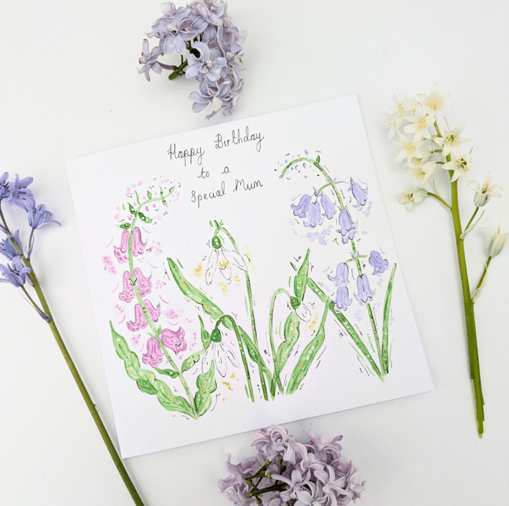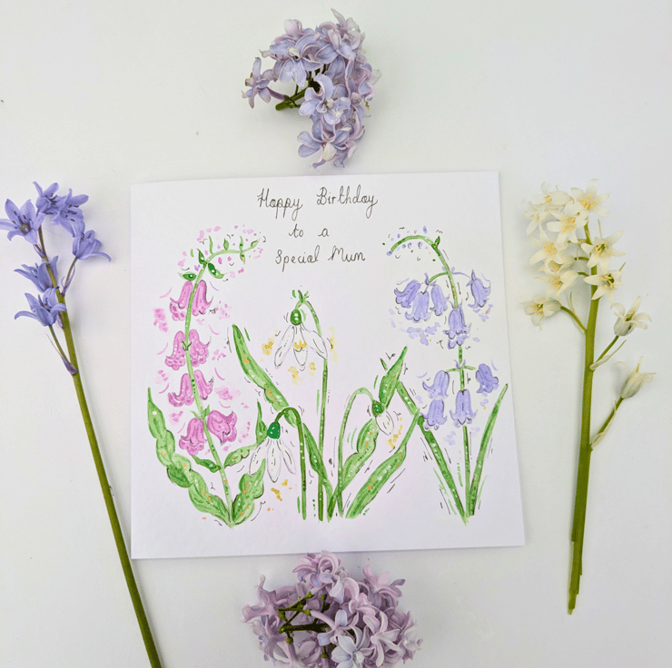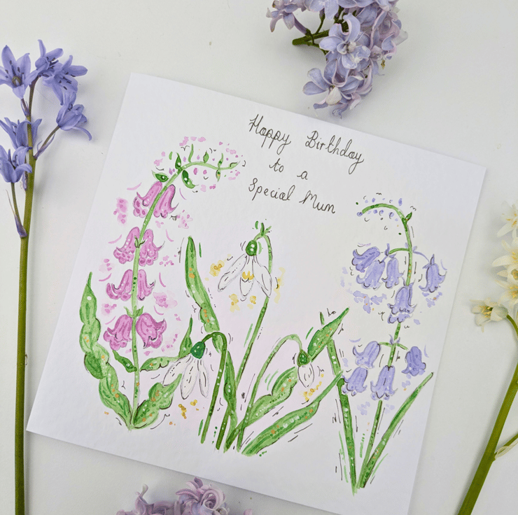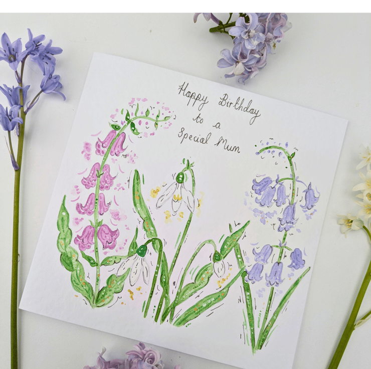 A beautiful hand-painted watercolour Wildflower greetings card, featuring bluebells, snowdrops and foxgloves.