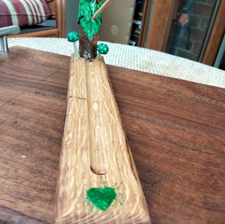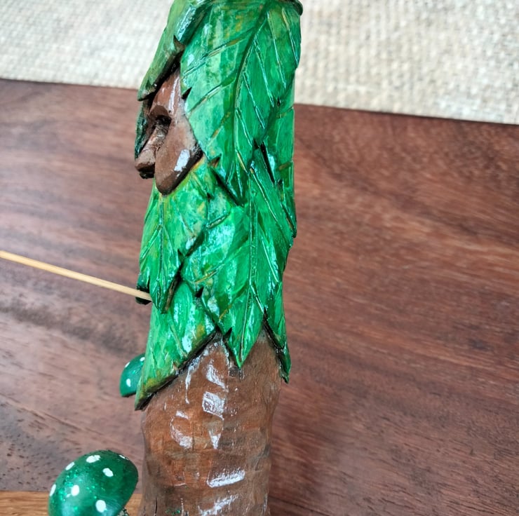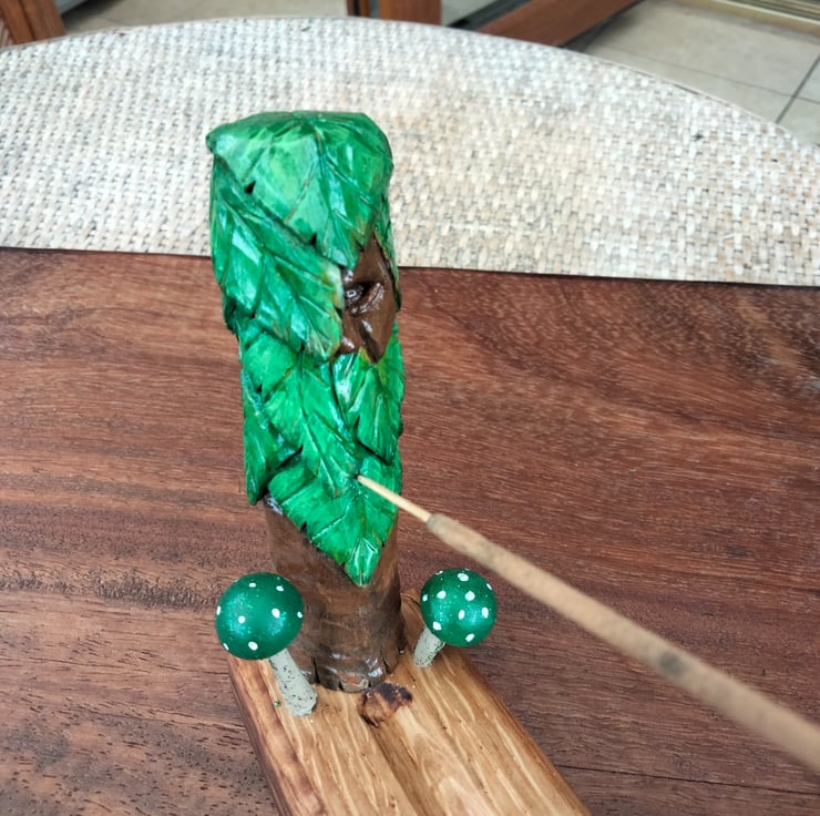 leaf man incense stick holder figure, has been carved from bassa wood, oiled and painted using acrylic paint. The base is solid oak, oiled and recycled from an old post. The figure is screwed on by a double ended wood screw so can be disasembled. The colours may differ slightly from the photo. Any questions please ask.