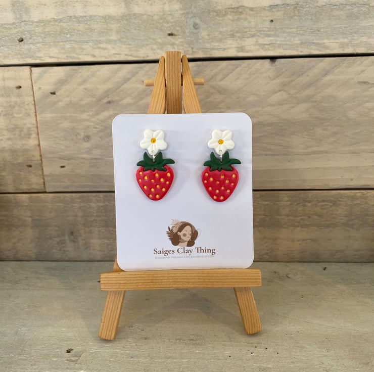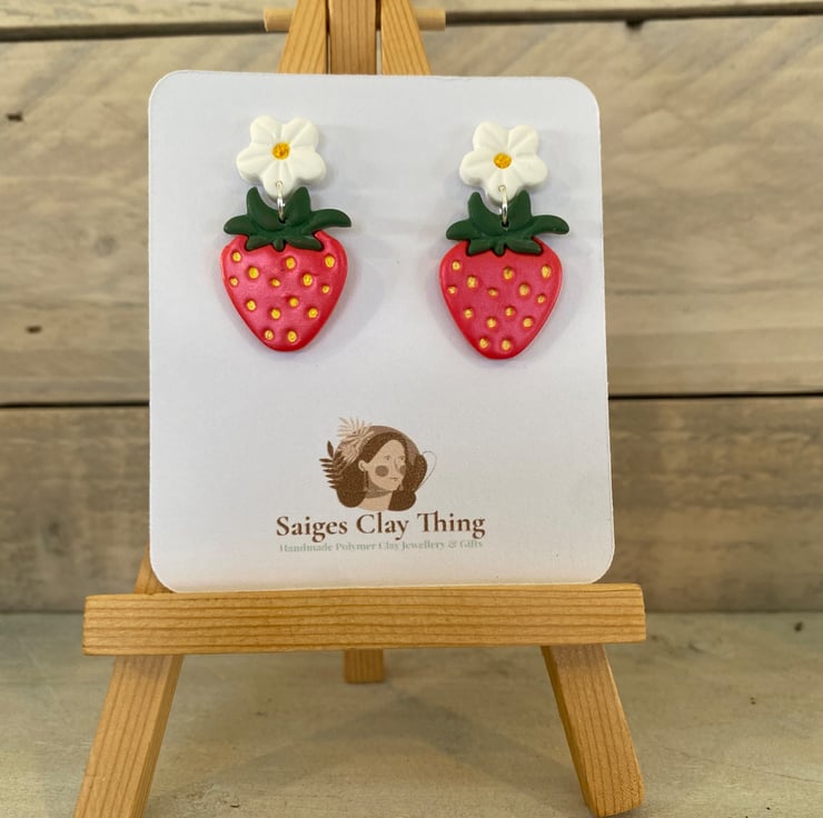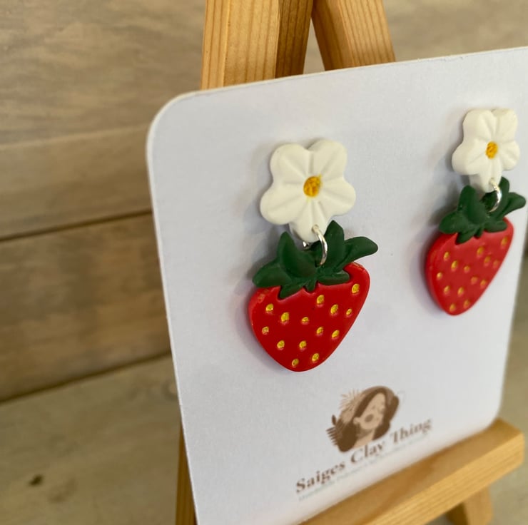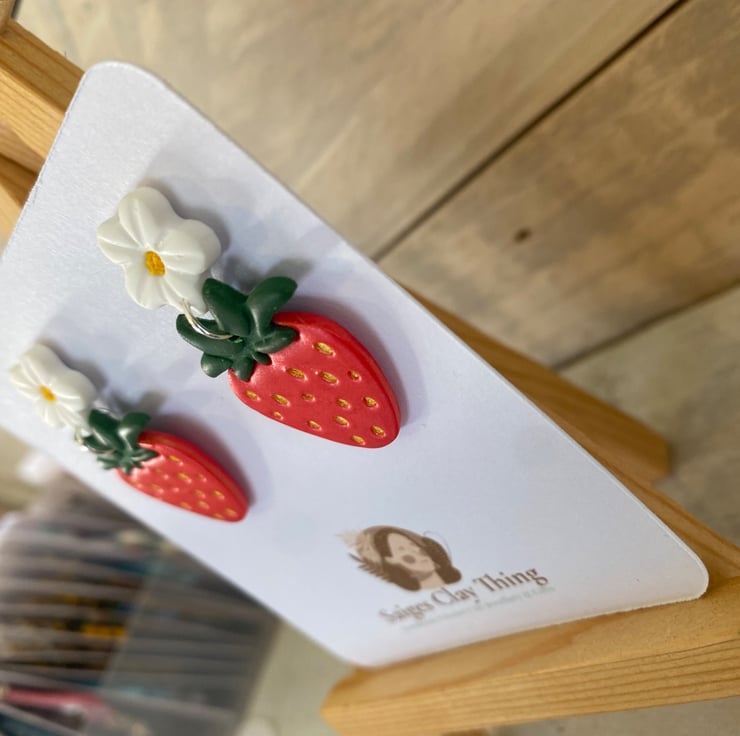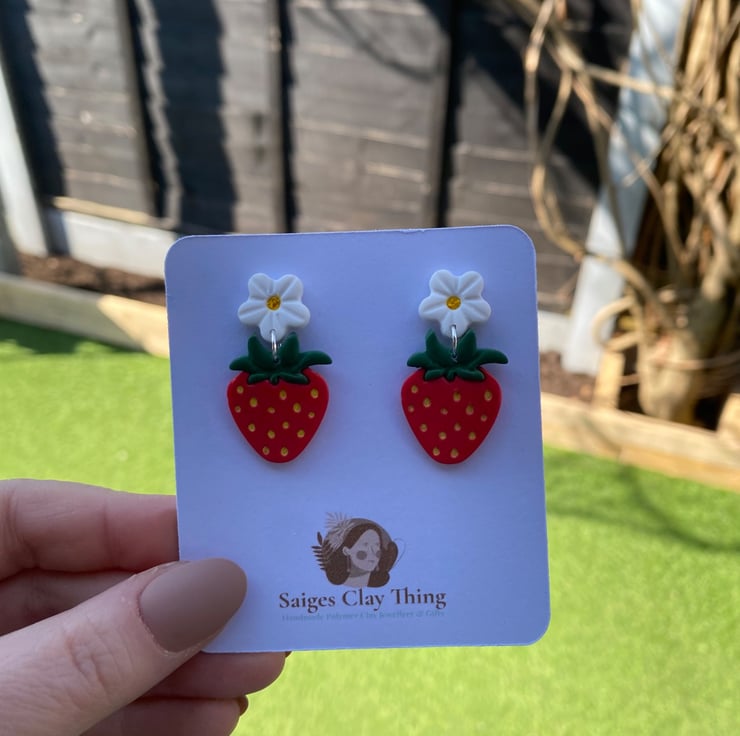 Sweet strawberry and daisy earrings, handmade from polymer clay. Lightweight, playful, and perfect for adding a fresh, summery touch to any outfit.