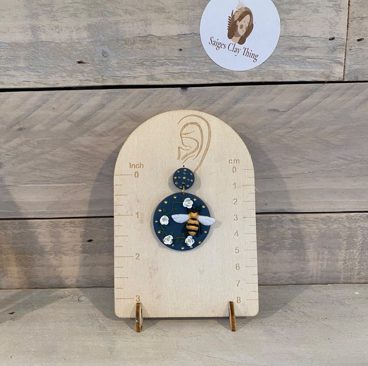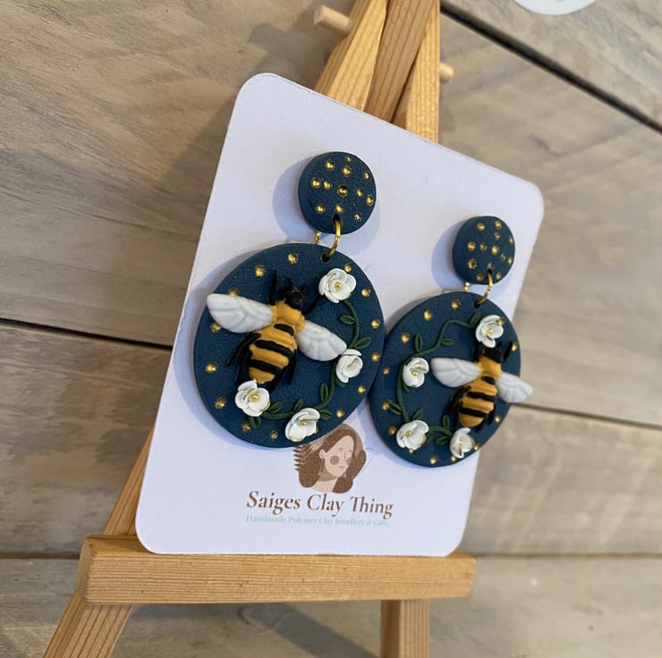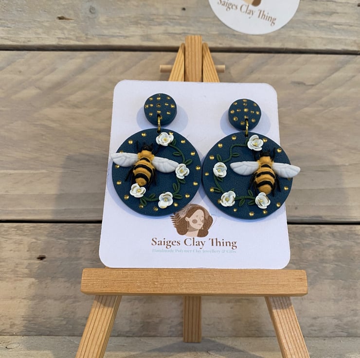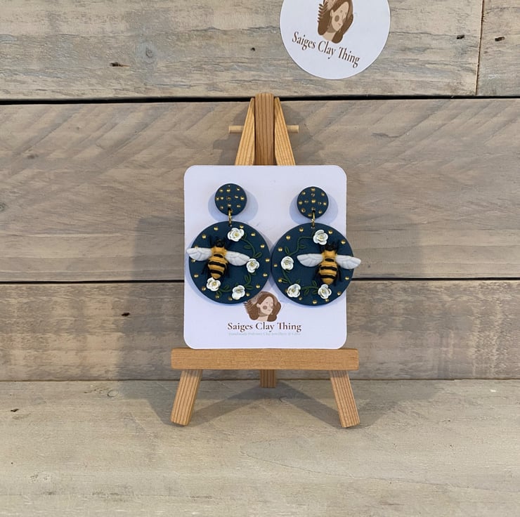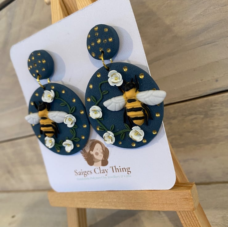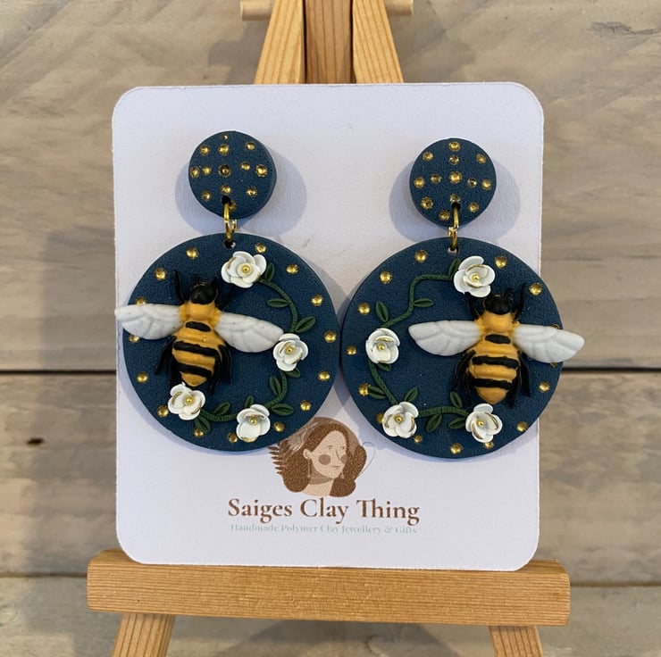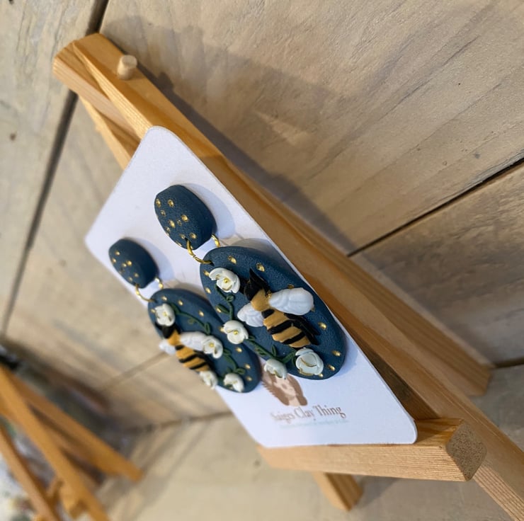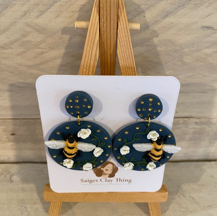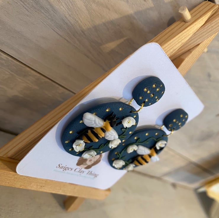 Whimsical bumblebee earrings with delicate white florals, handmade from polymer clay with hand-painted details. Set on a blue base with gold accents, they're lightweight, comfortable, and full of charm. Perfect for nature lovers and unique, cottagecore style.