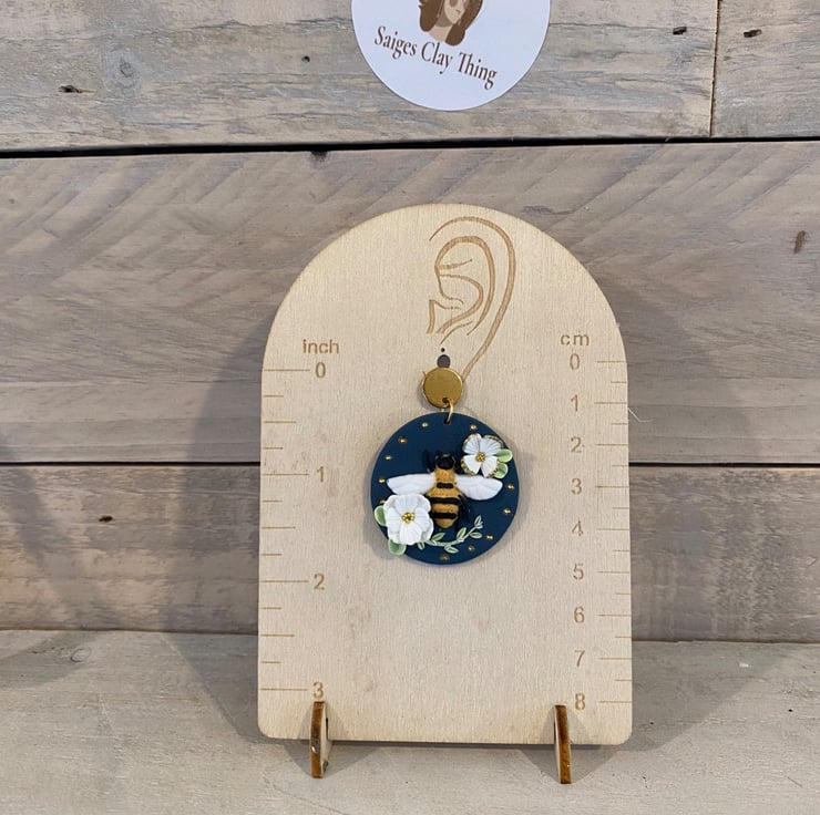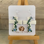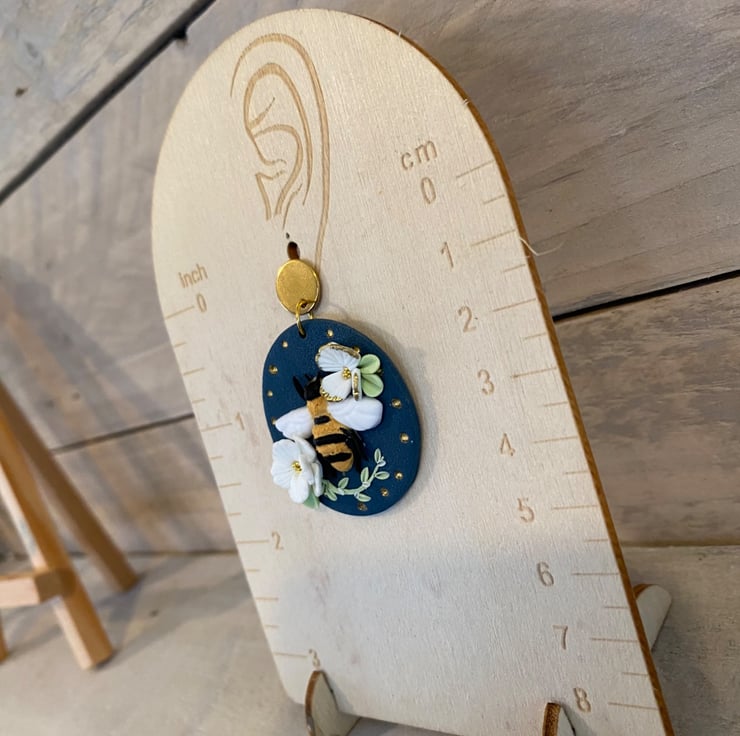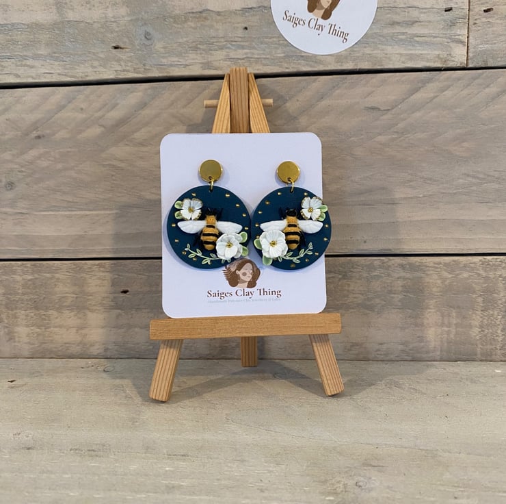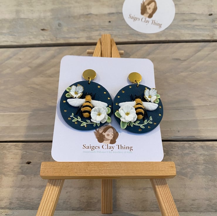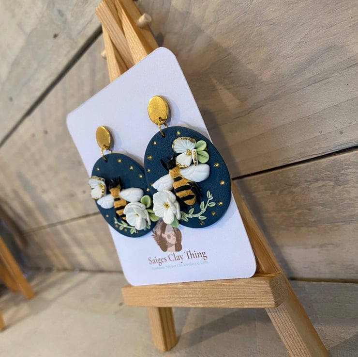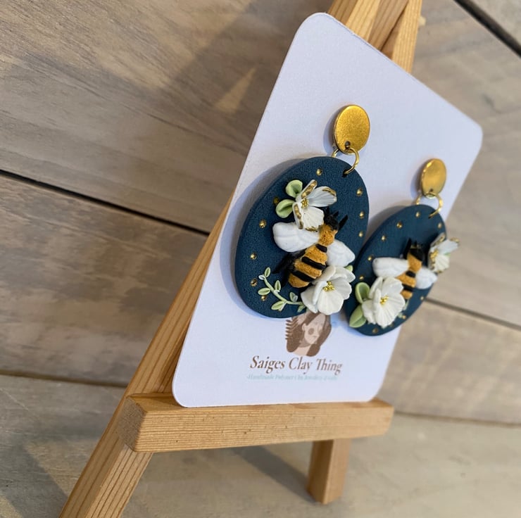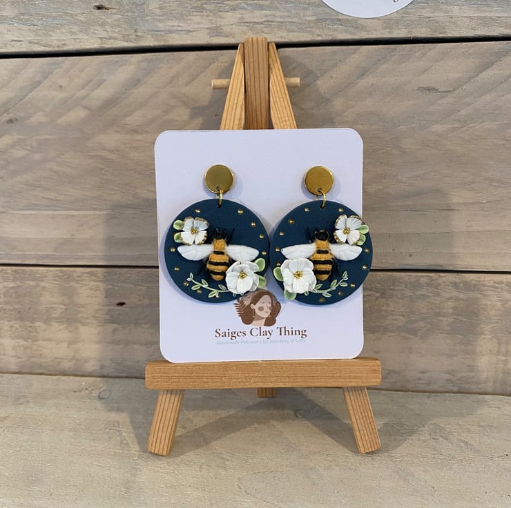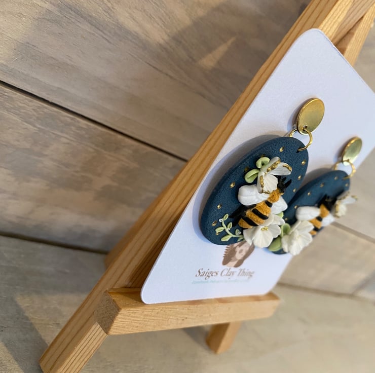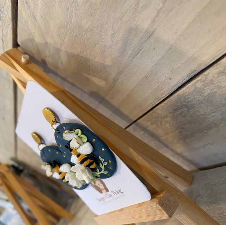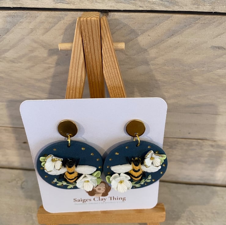 Whimsical bumblebee earrings with delicate white florals, handmade from polymer clay with hand-painted details. Set on a blue base with gold accents, they're lightweight, comfortable, and full of charm. Perfect for nature lovers and unique, cottagecore style.