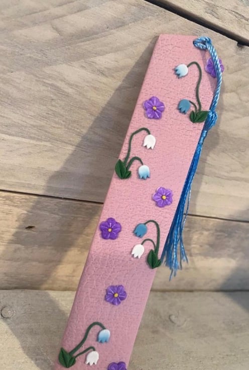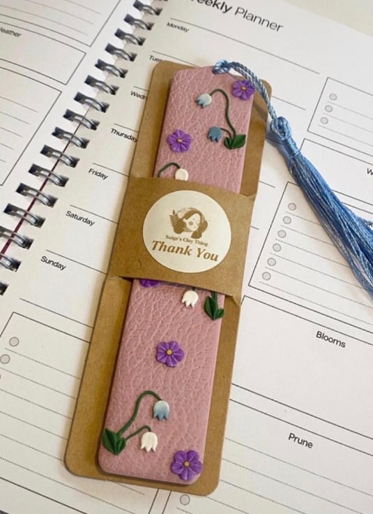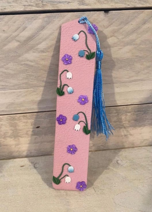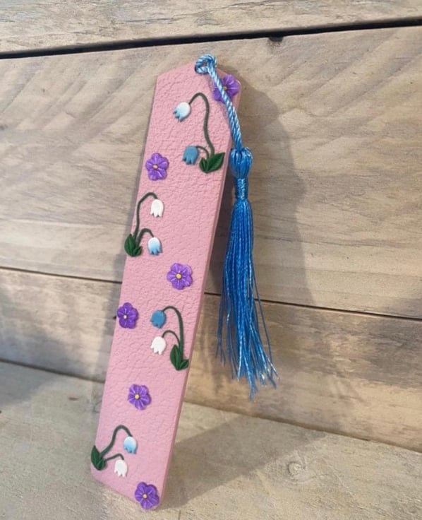 Handmade with polymer clay, featuring a textured pink background with 3D floral accents. Finished with a securely attached blue tassel, each bookmark is lightweight yet durable and completely one of a kind.