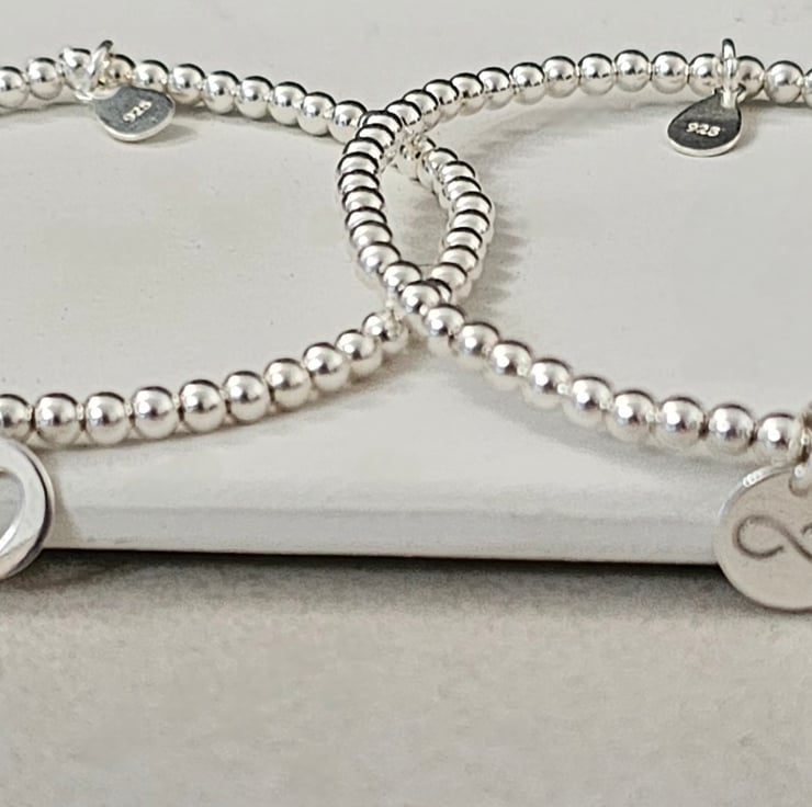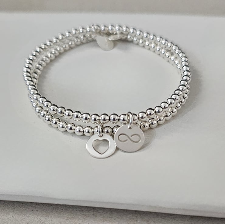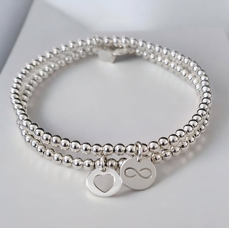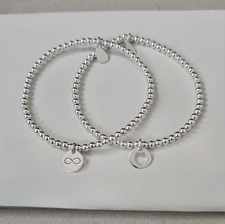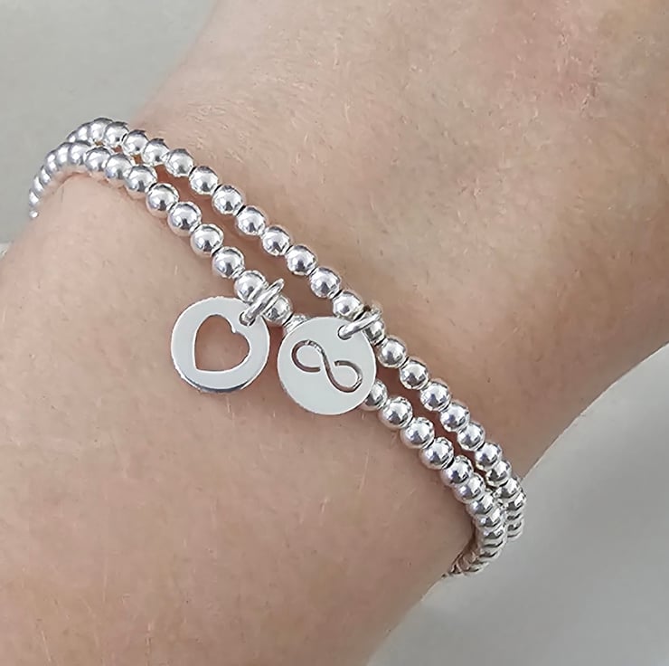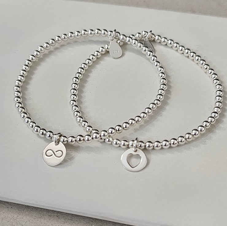A perfect addition to any jewellery collection. A Stunning set of round cut out Heart and Infinity charm disc stretch stacking bracelets that has style and beautifully designed and crafted with top quality Sterling silver. These cute little bracelets make a perfect gift or treat for yourself. Perfect for wearing together or individually. This listing is for two bracelets, one Heart symbol bracelet and one Infinity symbol bracelet. Bracelets come complete with a signature Silversoul Collection Gift box & and Button Pouch.