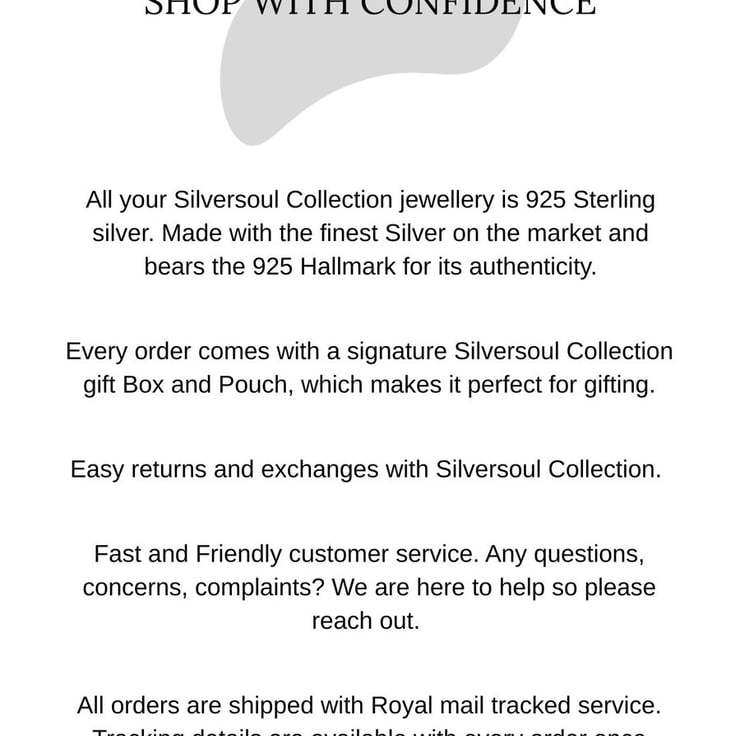 Your satisfaction means a lot to us here at Silversoul Collection and if you are not completely satisfied with your order we accept Returns on our jewellery (excluding earrings) We offer a 14 day money back guarantee. Jewellery must be returned unworn and in its original condition and packaging.