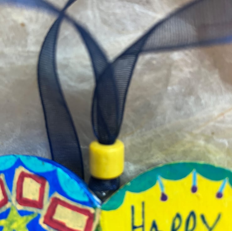 It hangs by a dark blue organza ribbon with a yellow wooden bead.