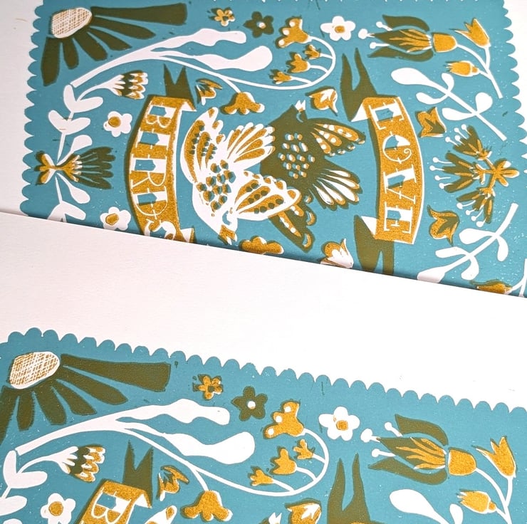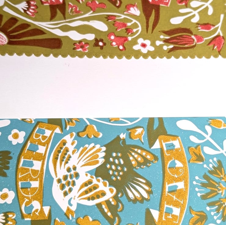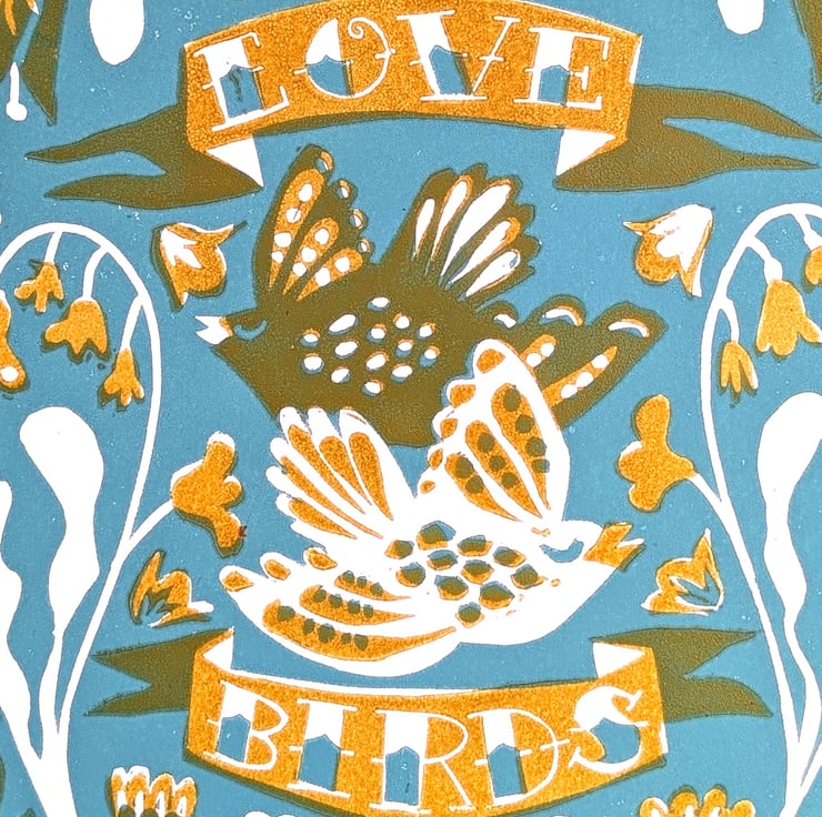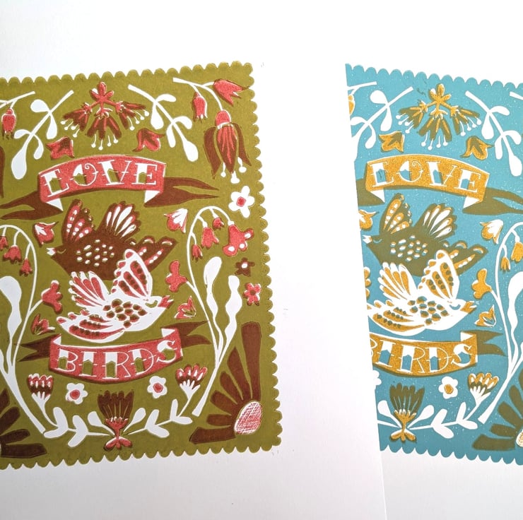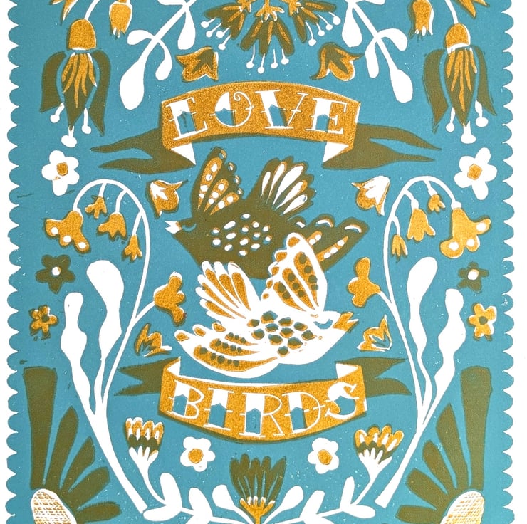 A gorgeous A3 print of my own design showing two little love birds fluttering around a meadow full of wild flowers. Handprinted in 2 beautiful colourways. (See separate listings for alternative colours.)