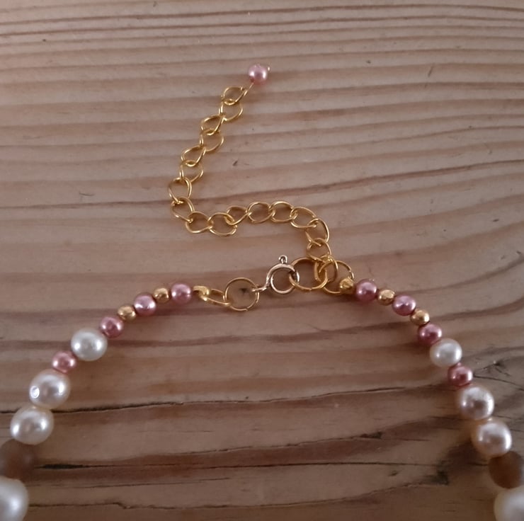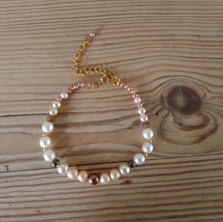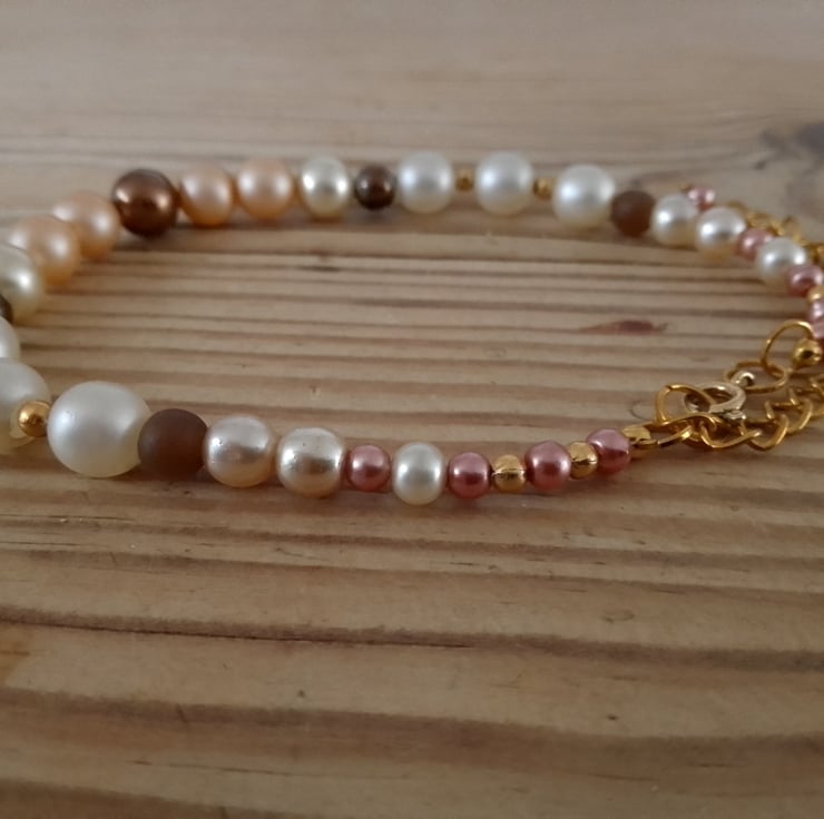 This handmade beaded bracelet is made using a combination of orange and ivory pearl beads. The bracelet is made of recycled beads making this a unique piece.