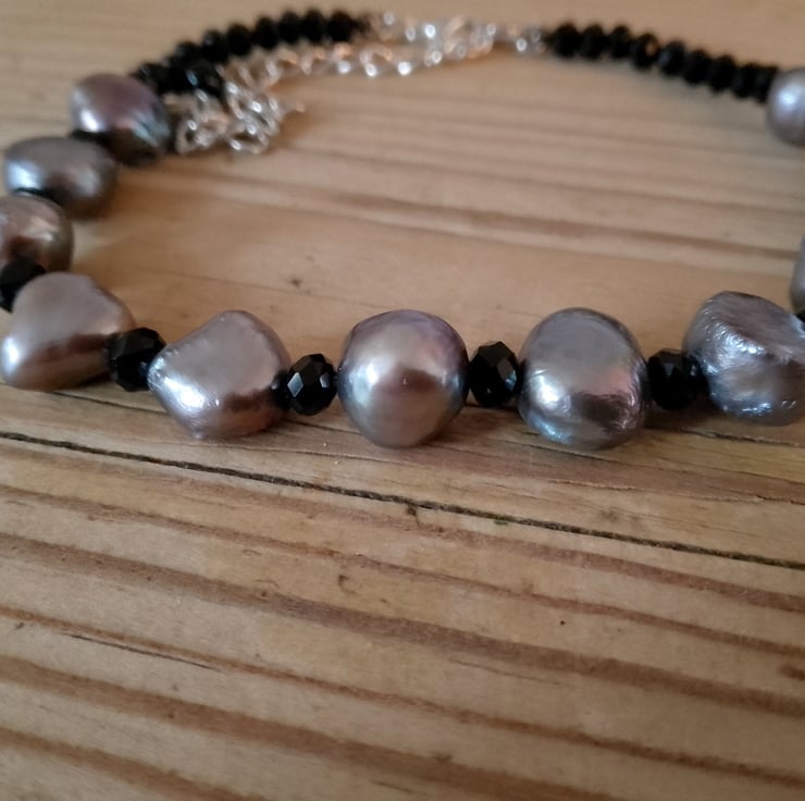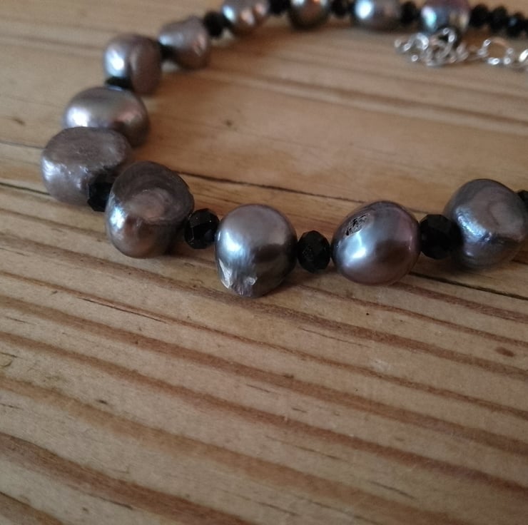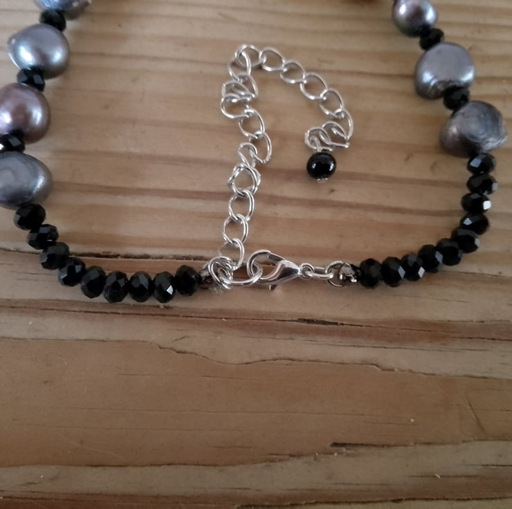 This handmade beaded bracelet is made using a combination of shaped blue pearl beads and small black resin beads. The bracelet is made using recycled beads.