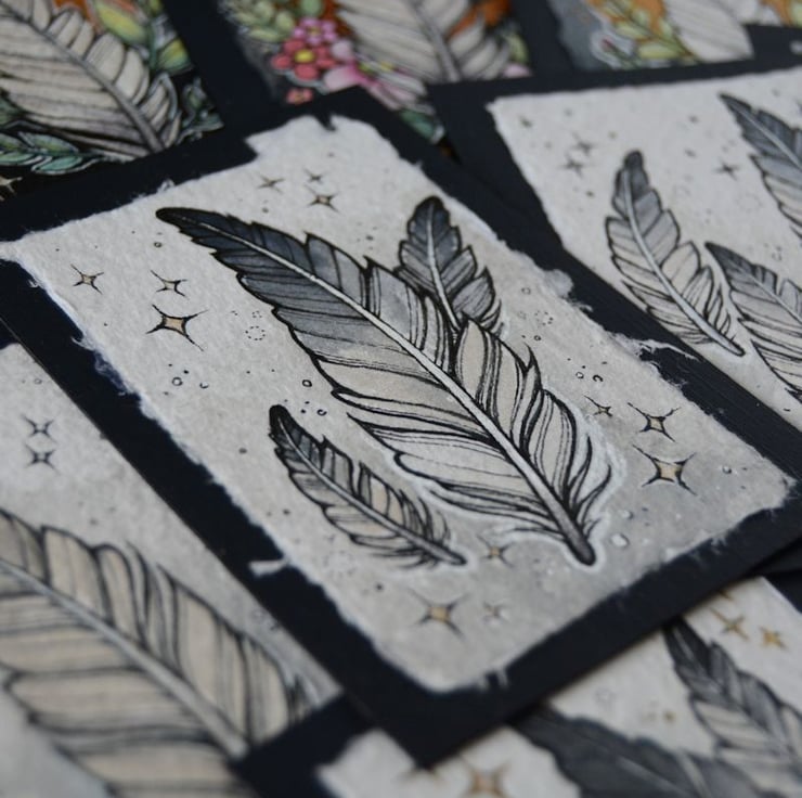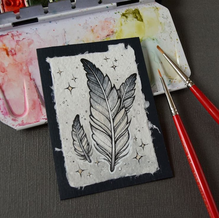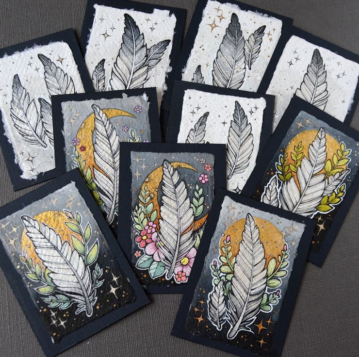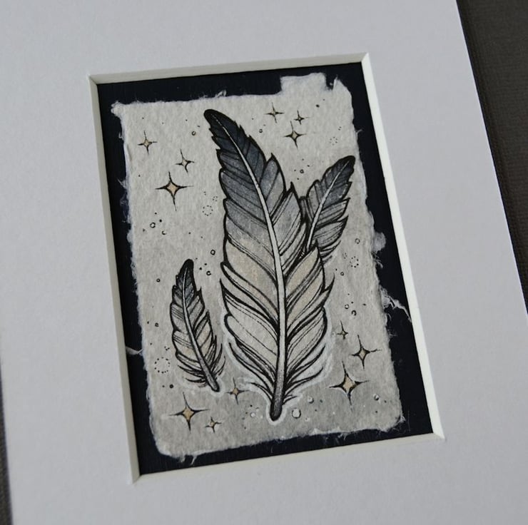 this aceo is an original artwork, hand drawn with a tiny 0.05 nibbed pen, then coloured with ink, artists pens and watercolour paints, on indian khadi paper. khadi paper is handmade from recycled cotton rag, it has a lovely textured surface and deckled edges. i have then mounted the illustration onto 300gsm cardstock, hand painted with a paynes grey to create a dark surrounding edge/background.