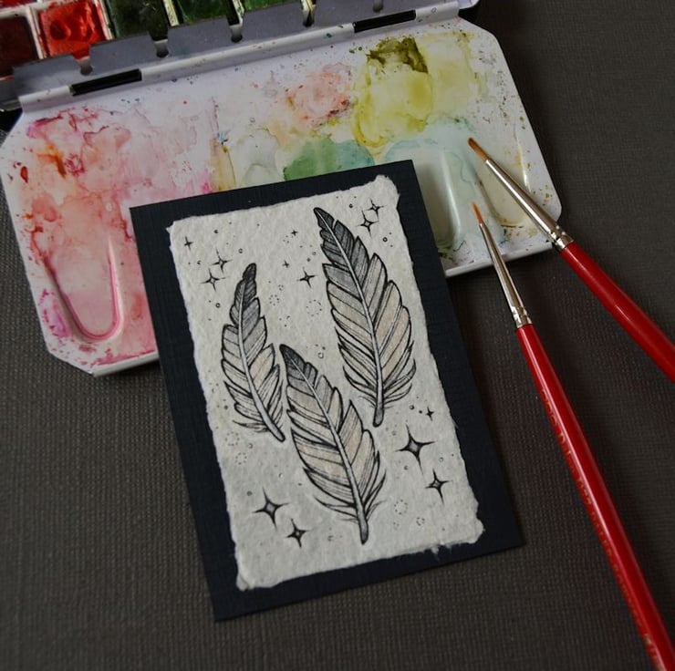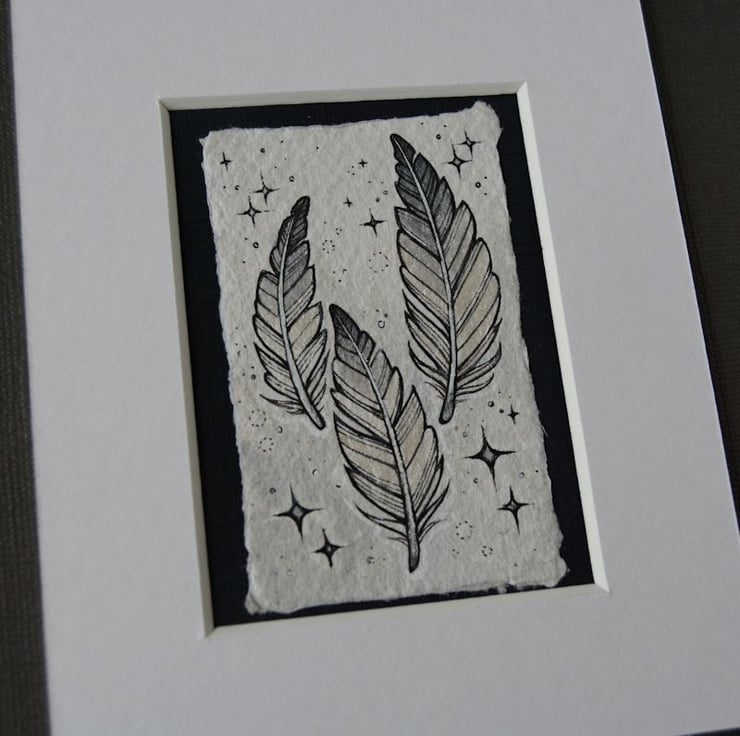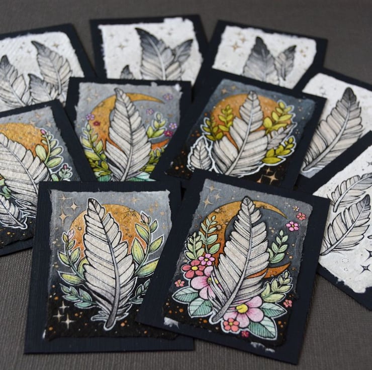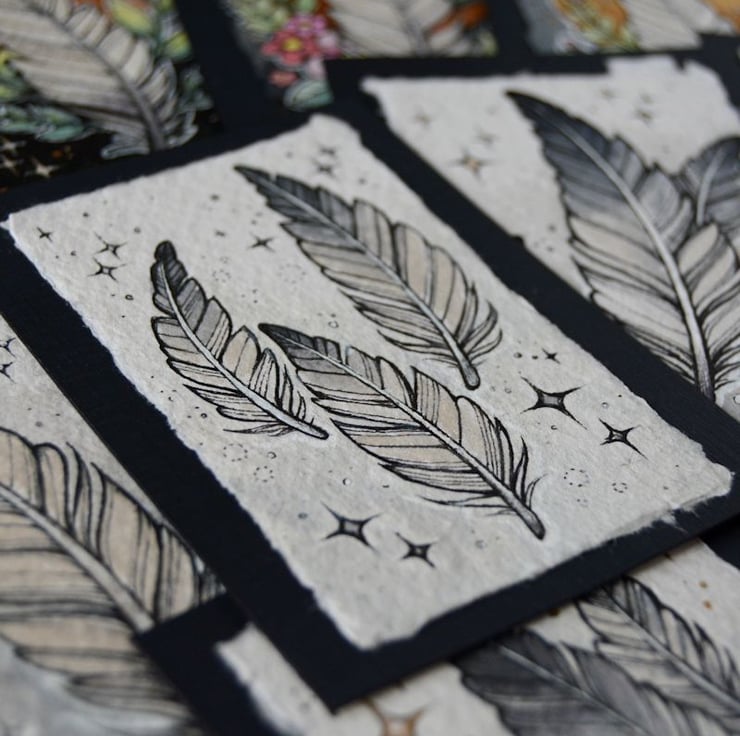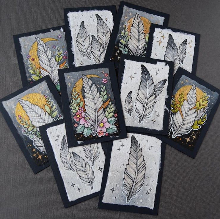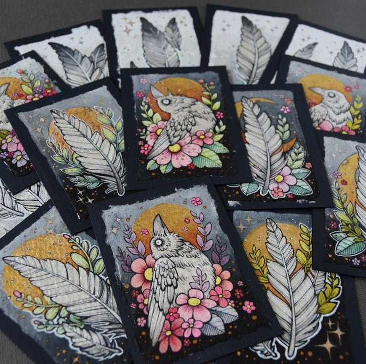 this aceo is an original artwork, hand drawn with a tiny 0.05 nibbed pen, then coloured with ink, artists pens and watercolour paints, on indian khadi paper. khadi paper is handmade from recycled cotton rag, it has a lovely textured surface and deckled edges. i have then mounted the illustration onto 300gsm cardstock, hand painted with a paynes grey to create a dark surrounding edge/background.