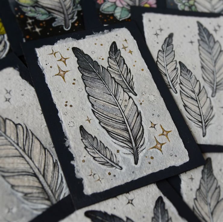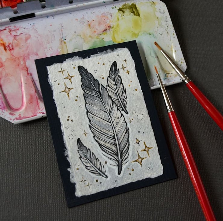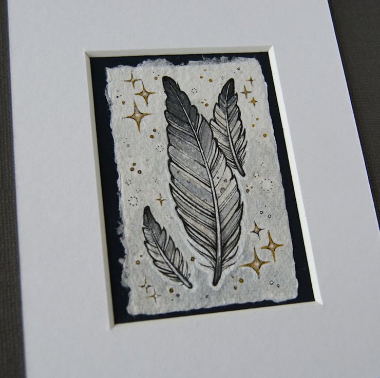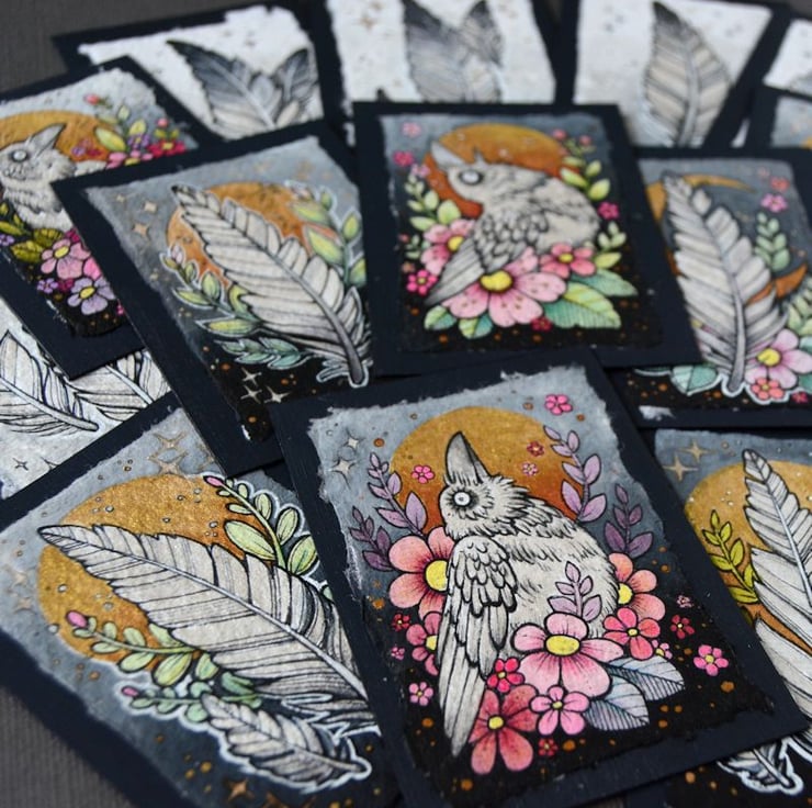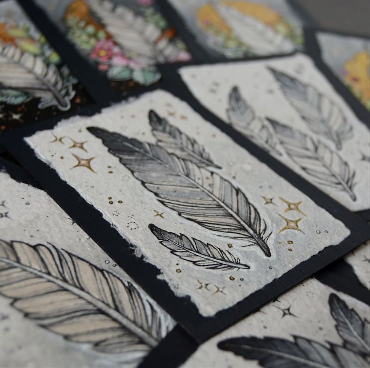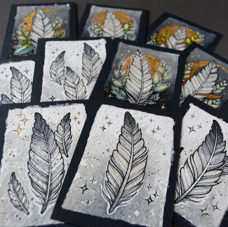this aceo is an original artwork, hand drawn with a tiny 0.05 nibbed pen, then coloured with ink, artists pens and watercolour paints, on indian khadi paper. khadi paper is handmade from recycled cotton rag, it has a lovely textured surface and deckled edges. i have then mounted the illustration onto 300gsm cardstock, hand painted with a paynes grey to create a dark surrounding edge/background.