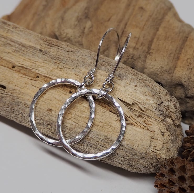 Handmade silver hoop earrings. Great earrings for everyday wear. The silver has been hammered to add a bit of texture and sparkle. They hang from handmade argentium silver 940 (hypoallergenic) ear wires.
