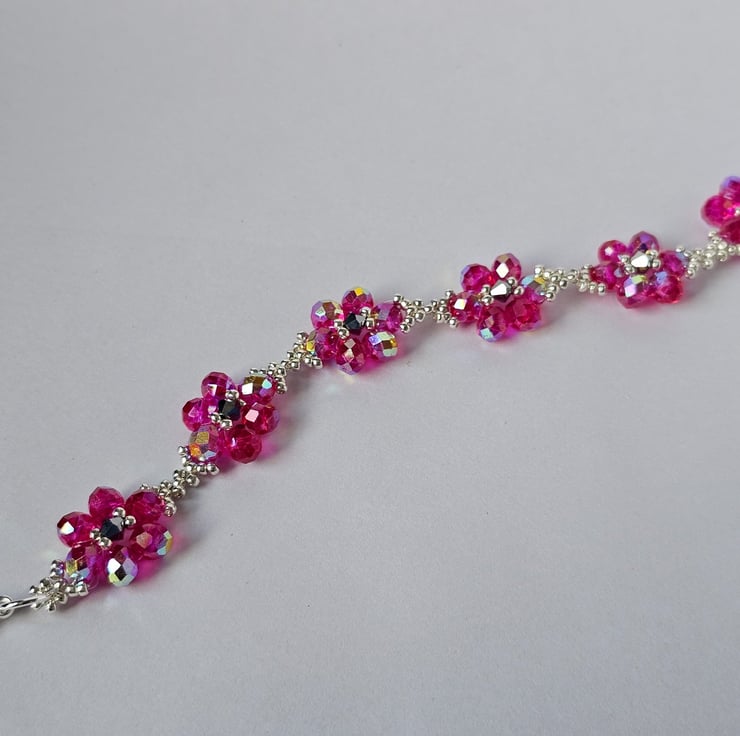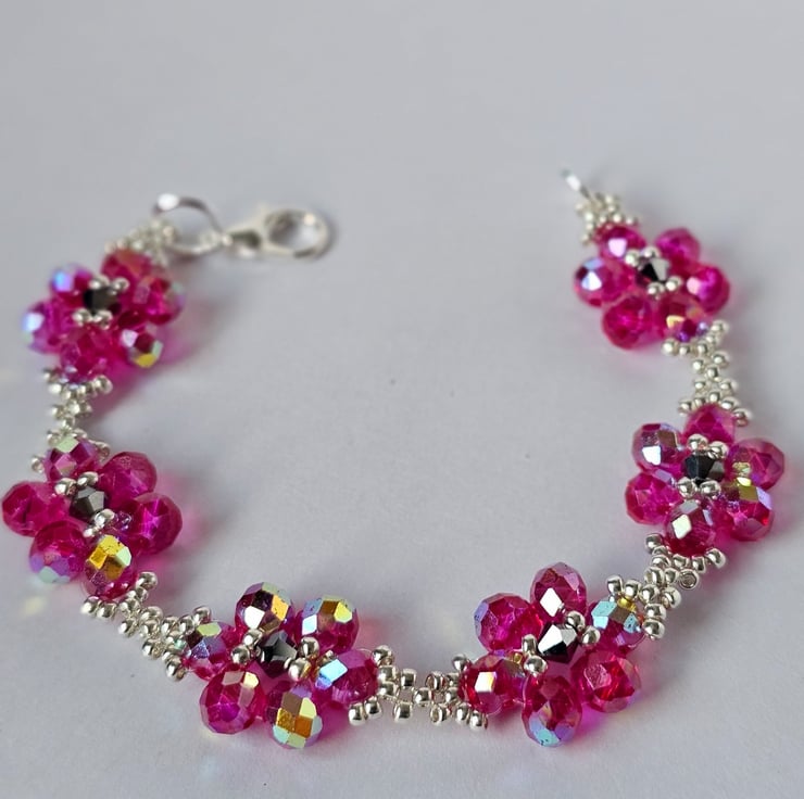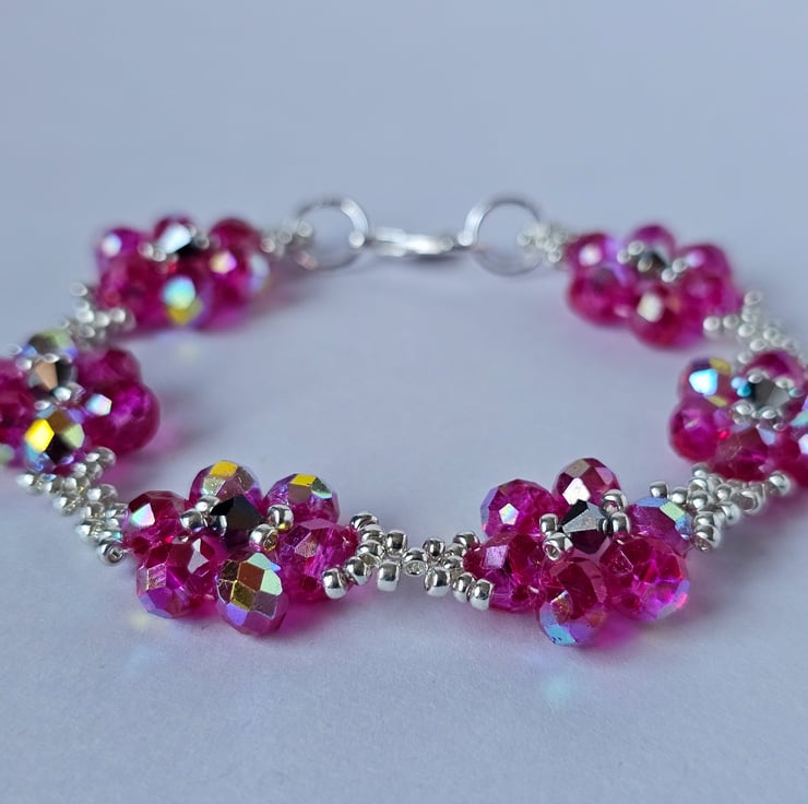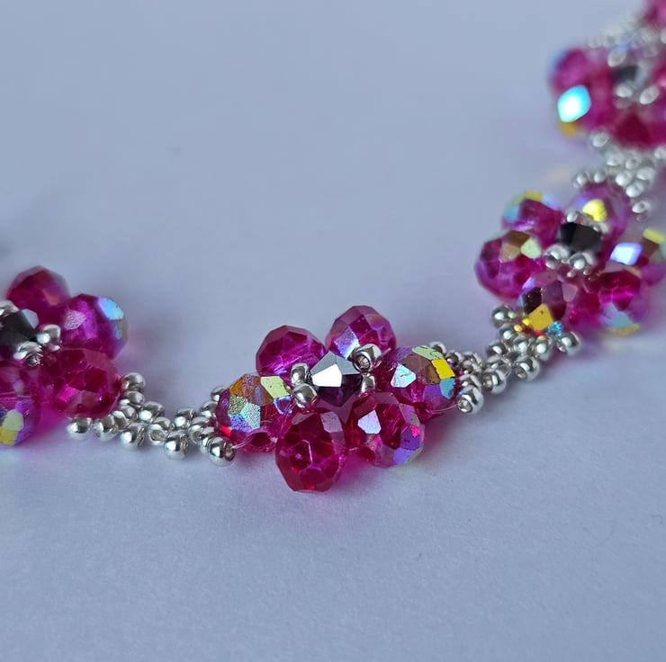 Handmade beaded bracelet featuring vibrant faceted glass beads arranged in delicate floral clusters, accented with shimmering silver-tone seed beads. A bold yet elegant piece that adds a pop of colour and sparkle to any outfit. Finished with a secure clasp.