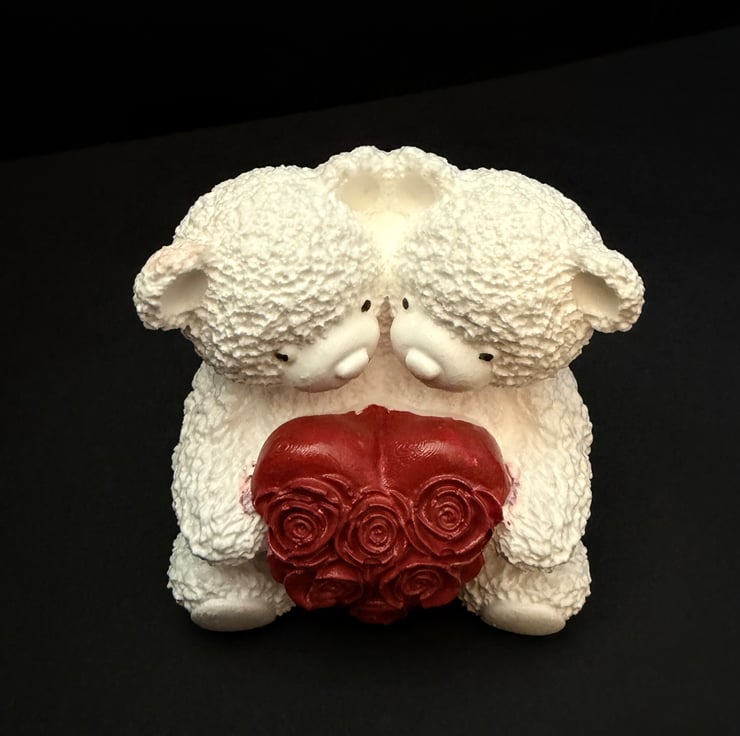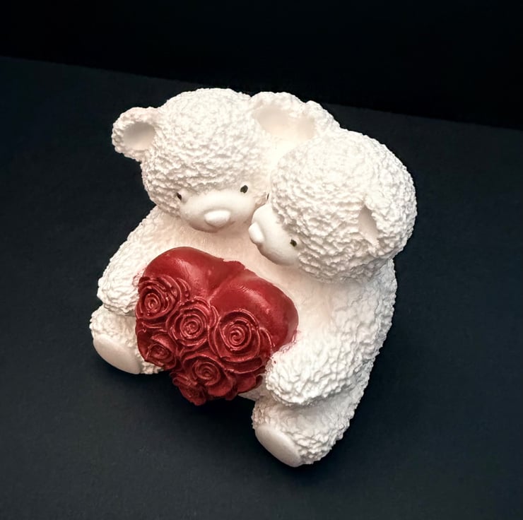 Cute little 2 bear ornament in white with hand painted red rose heart. 6cm wide, 7cm high and 5cm depth.
