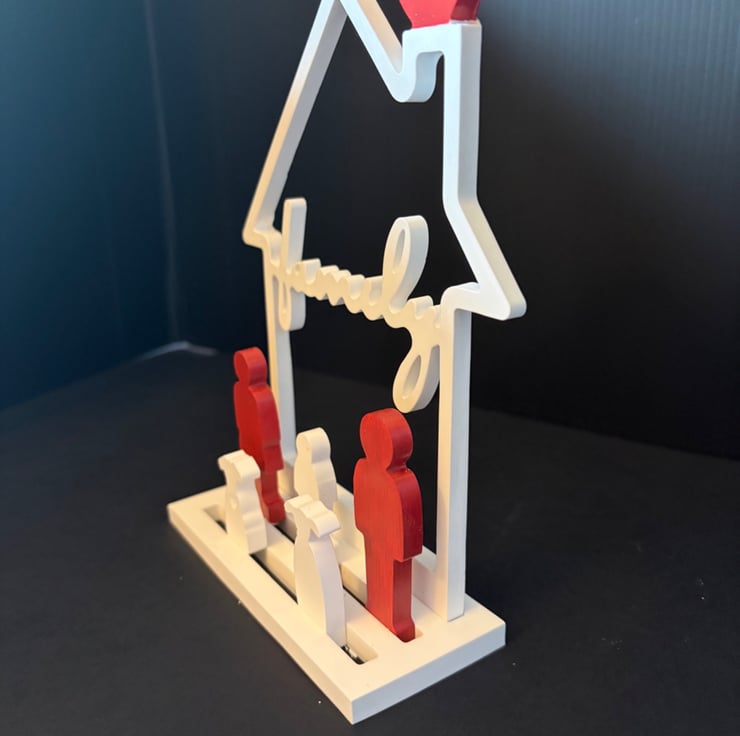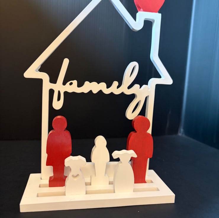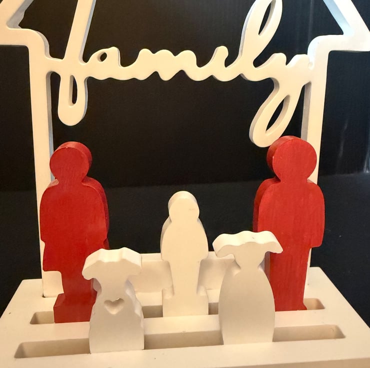 Lovely family ornament with interchangeable 2 adults and 3 children. 17cm high, 13cm wide.