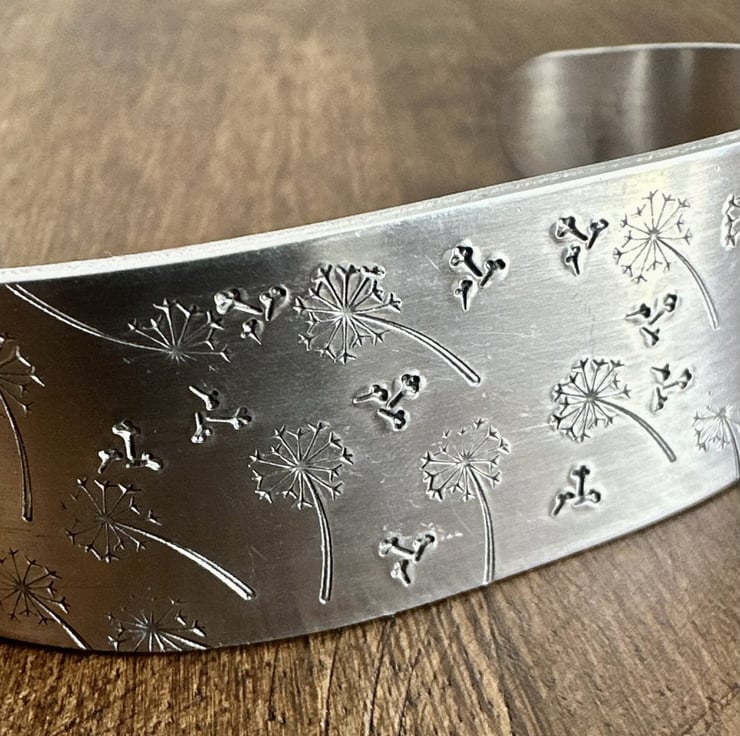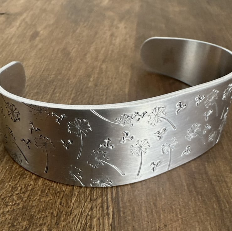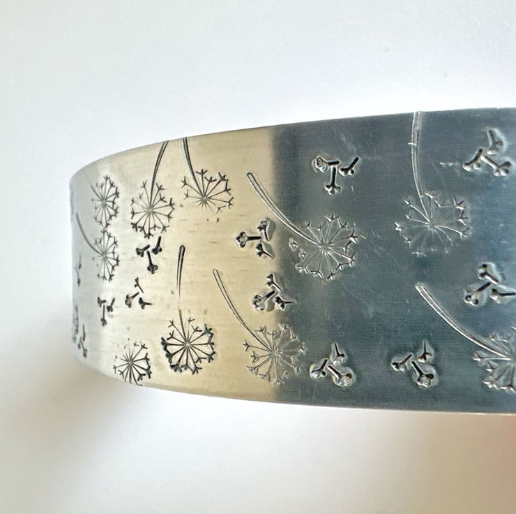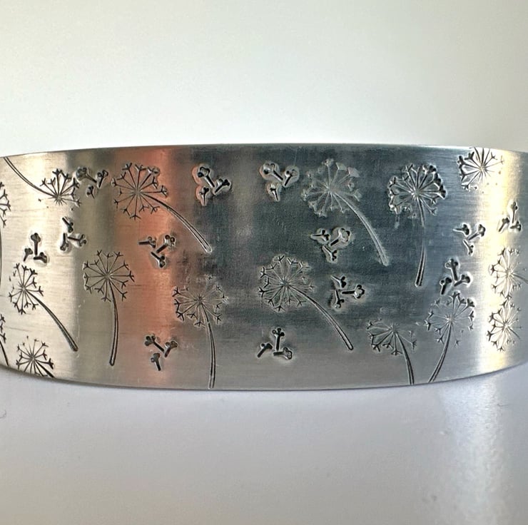 20mm Wide Brushed Aluminium Cuff Bracelet. Light weight, low allergy, adjustable design, featuring hand stamped Dandelion Seed Heads.