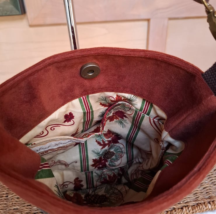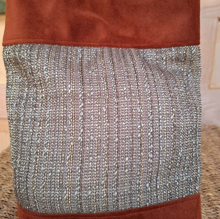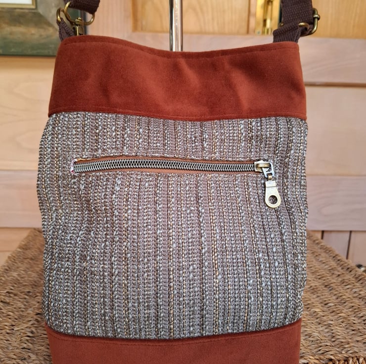 Lovely russet velvet crossbody bag, with woven front panel featuring subtle gold threads. Zipped outer pocket, lined in cotton print with inside pocket, magnetic fastener and adjustable cotton webbing strap.