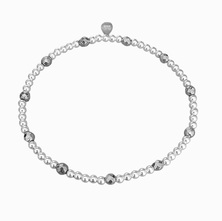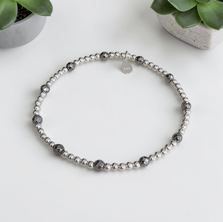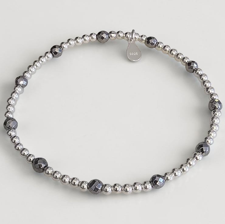 Sterling Silver & Silver/Grey Hematite stretch bracelet. Beautifully designed with sparkly Hematite beads and Sterling silver beads. Truly a lovely bracelet to own and one for your jewellery collection. Jewellery is presented with our signature Silversoul Collection gift box & pouch.