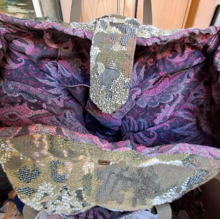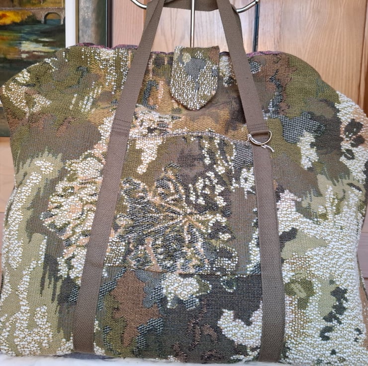 Large Gladstone-type carpet bag on a sprung metal frame, made from textured fabric in shades of green. Two outer pockets, and a magnetic tab closure for extra security. Line in abstract print cotton with inside pockets, cotton webbing handles and an extra detachable and adjustable strap for wearing crossbody if required.