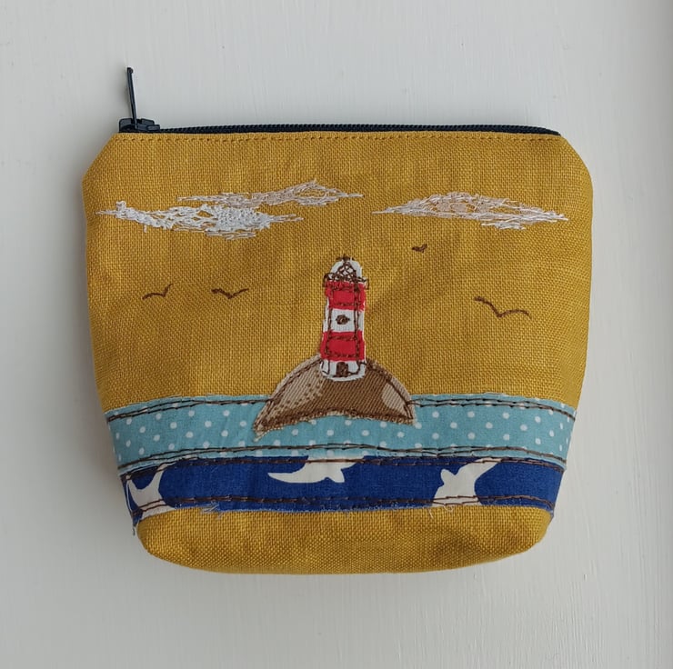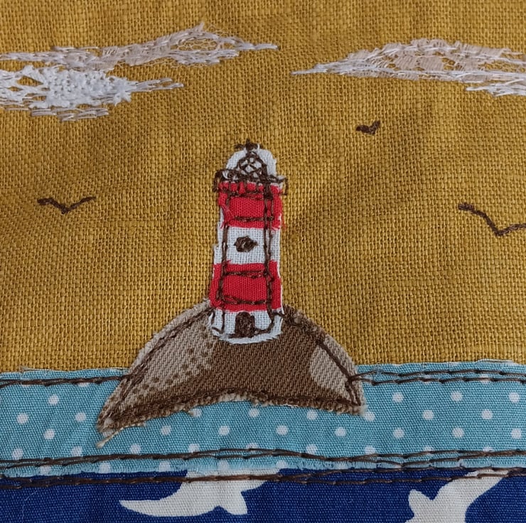 Made out of gorgeous mustard linen, it depicts a lighthouse on a rock in the middle of the sea, with lacy clouds and birds wheeling in the sky.