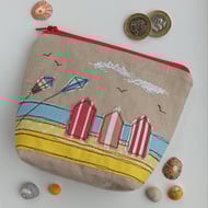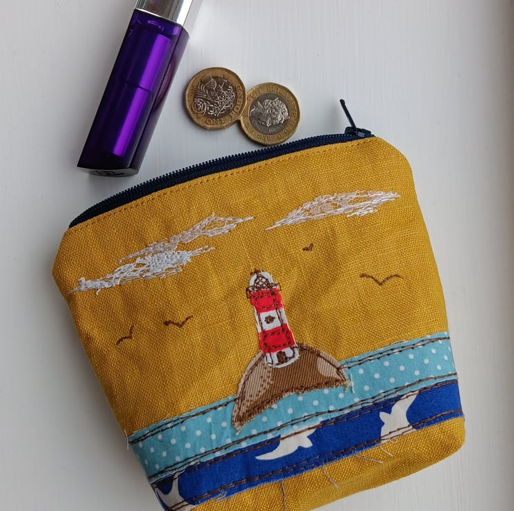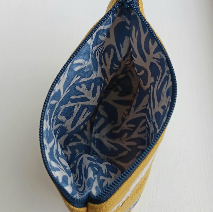 The purse measures approximately 14cm wide and 12cm high, has a fun seaweed style cotton lining and a navy zip.