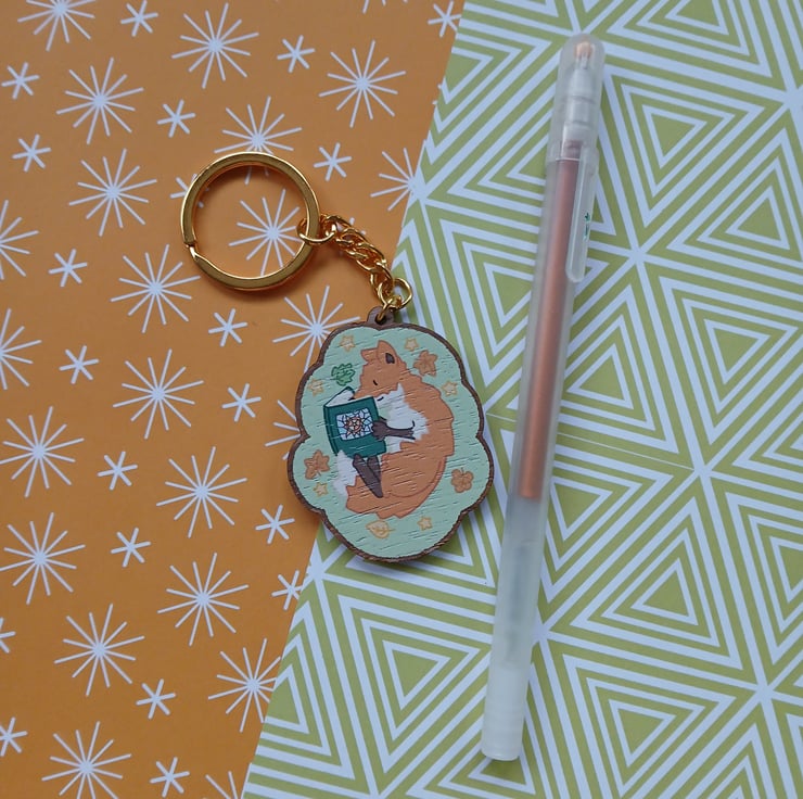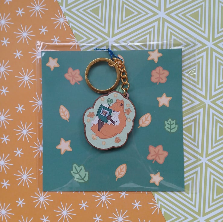 This keyring is great for readers and fox lovers! The gloss gives it a professional shine, and wood keyrings are great for environment conscious folk. It comes packaged with a matching backing card, making it gift ready.