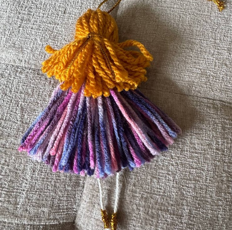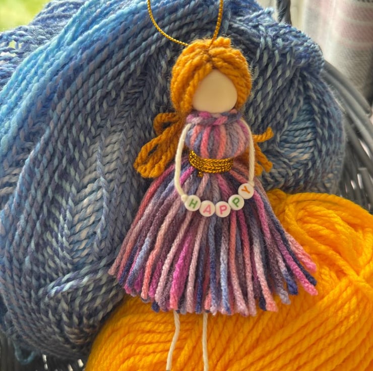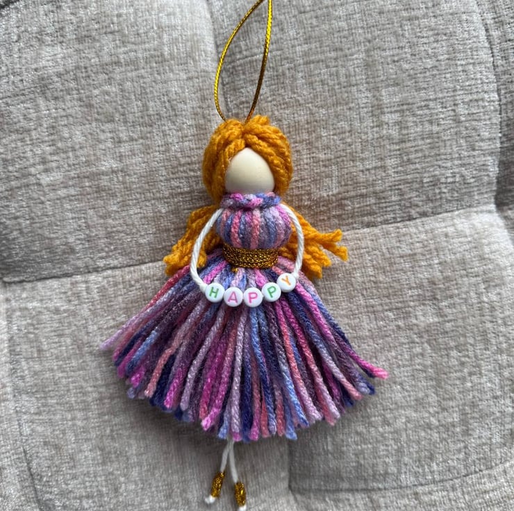Meet your new source of everyday joy. Handcrafted with meticulous care in my UK studio, this 'HAPPY' Angel is a visual anchor for positive vibes and wellbeing. Featuring my signature spirited ginger hair and a soft, tactile gown of variegated fluffy yarn in serene purples, blues, and pinks, it's a small piece of art designed to lift the spirits.