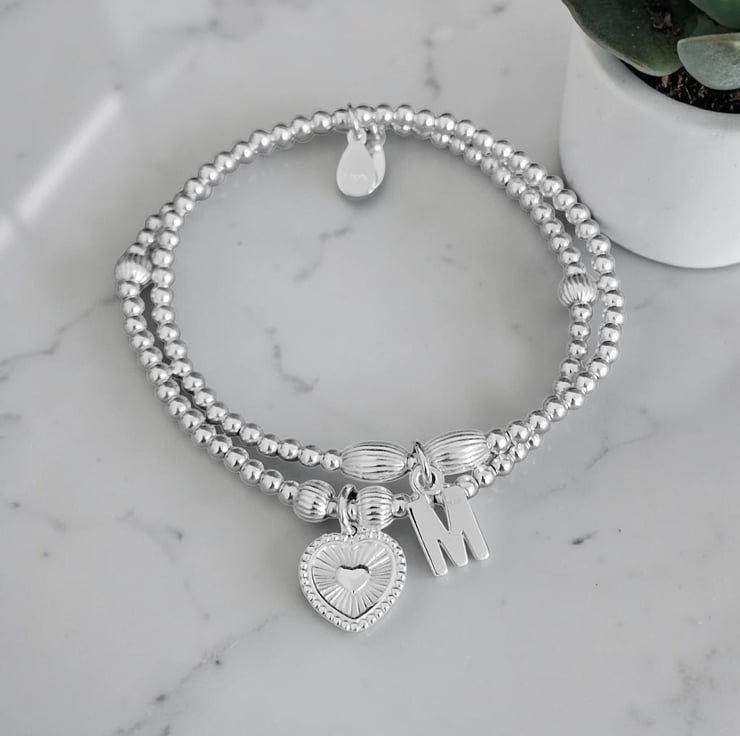 Sterling Silver Initial and Heart Charm Personalised Stretch Stacking Bracelets