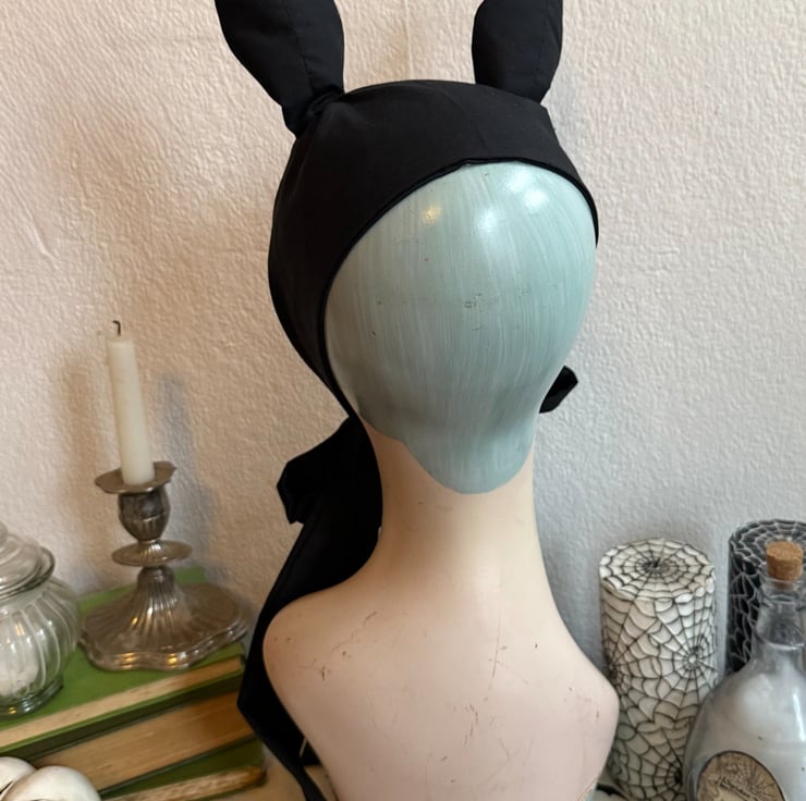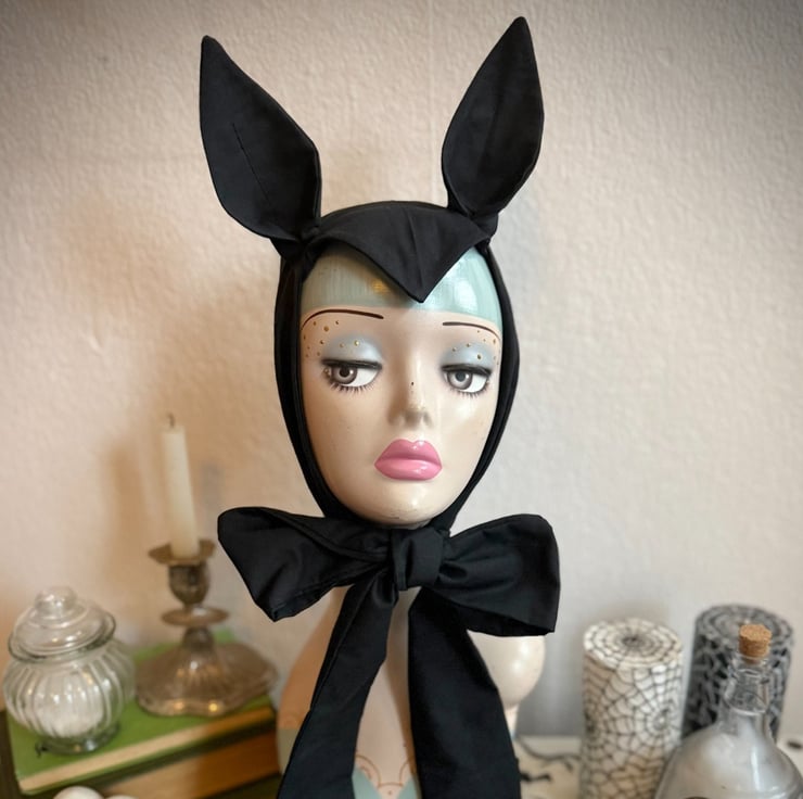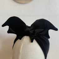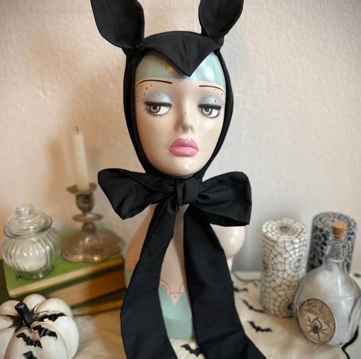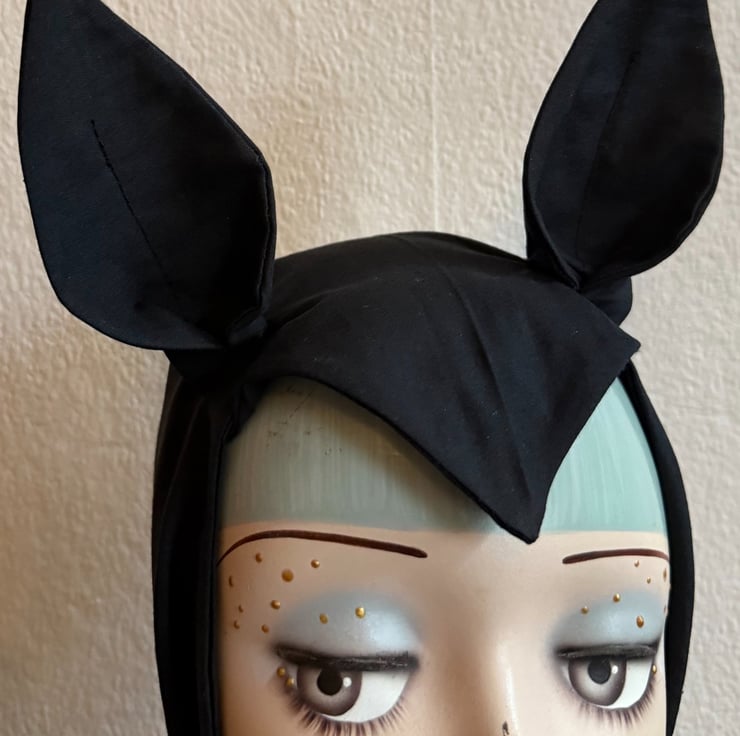 This exquisite bat ear headpiece is a must for any spooky soul. It ties into a bow for a truly gorgeous look, crafted from deadstock/sustainable fabric it's a versatile piece that allows for multiple styling options.