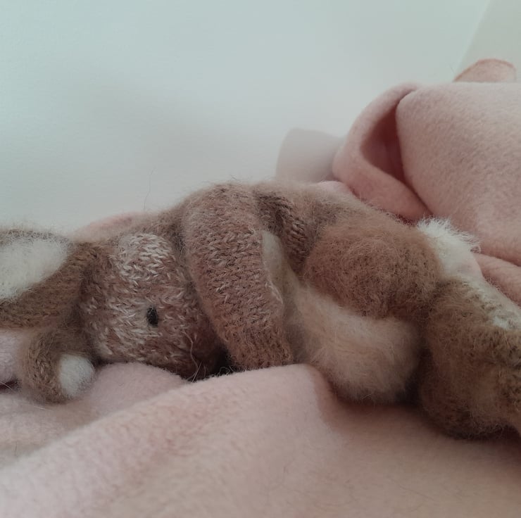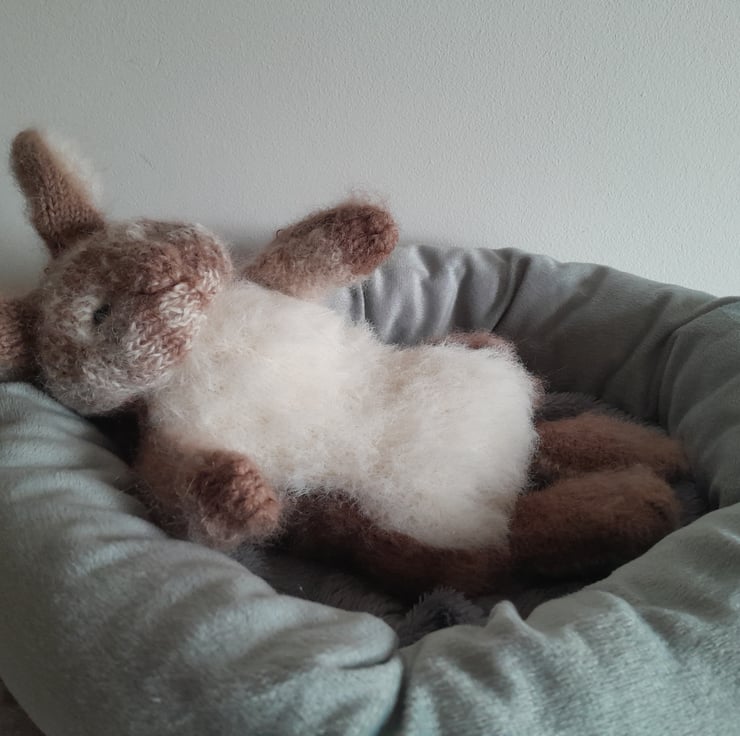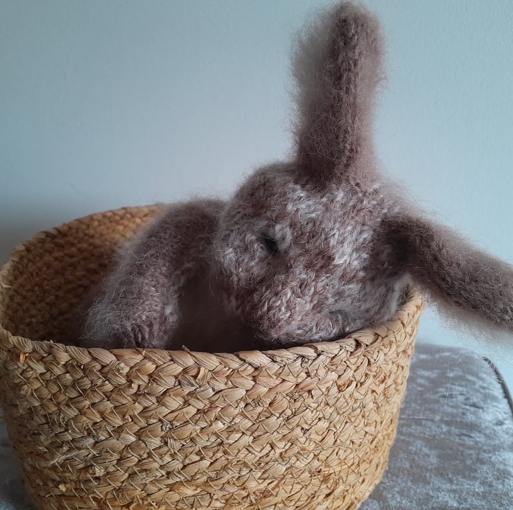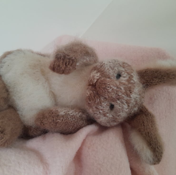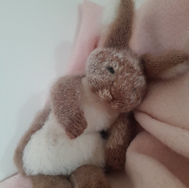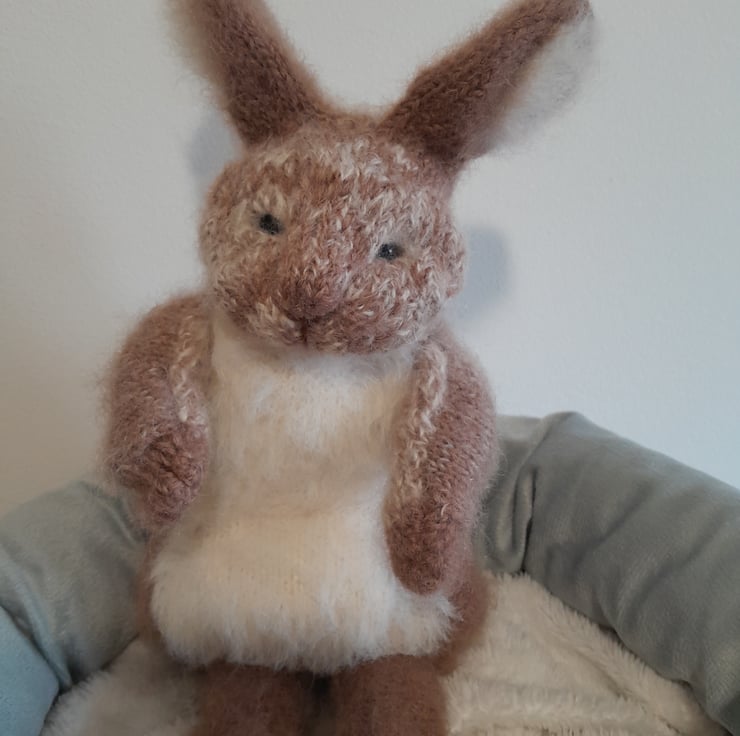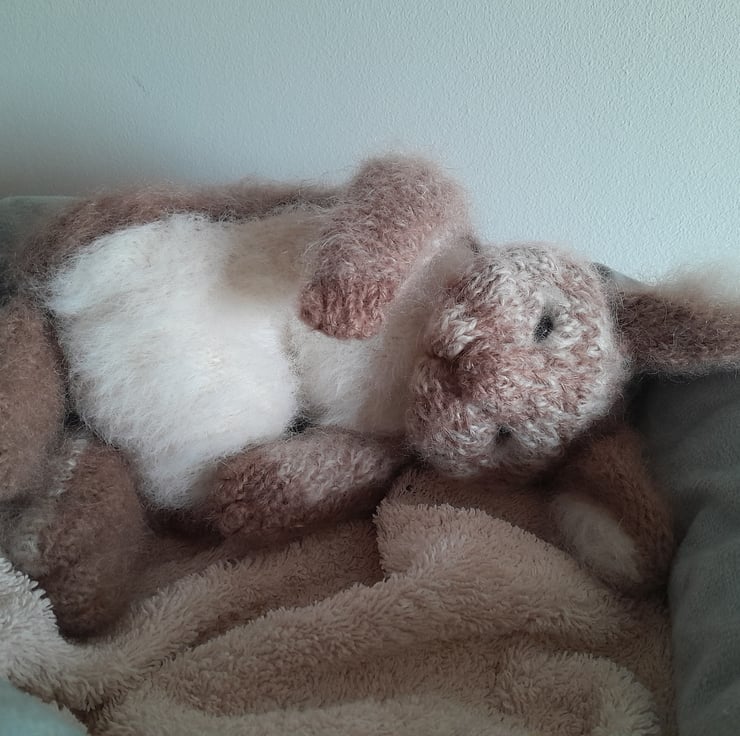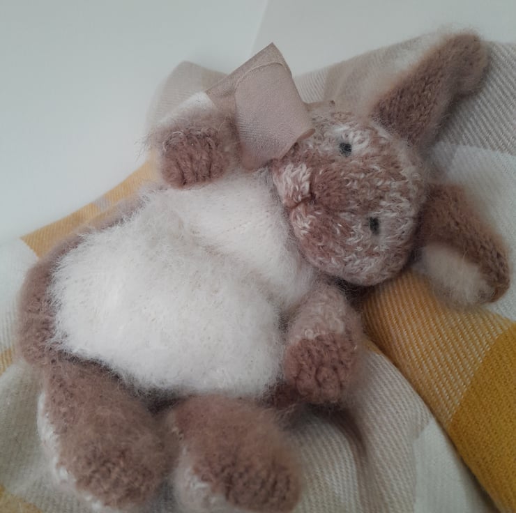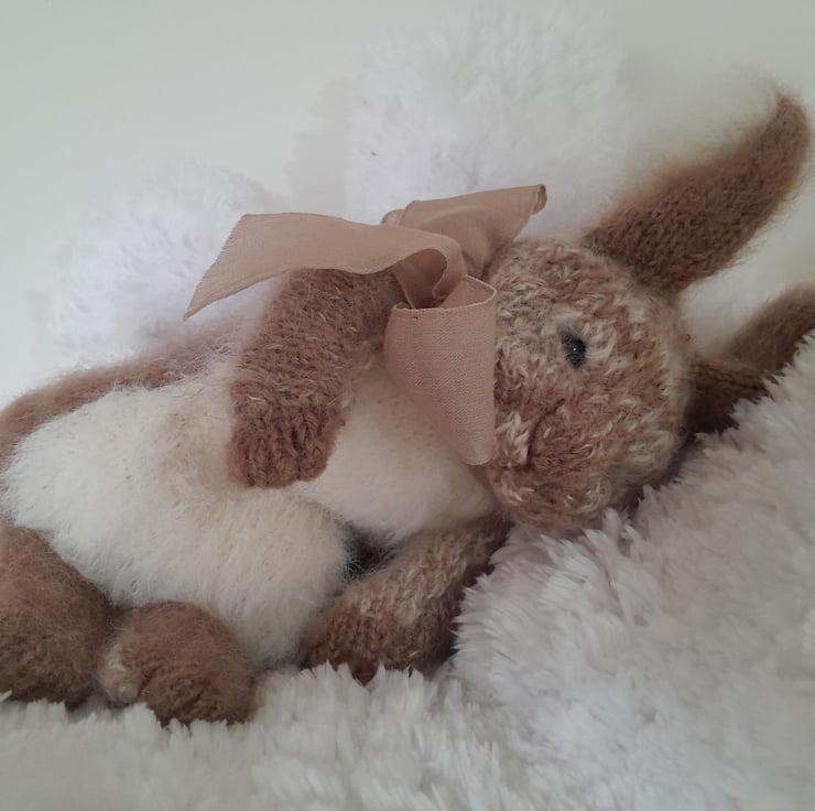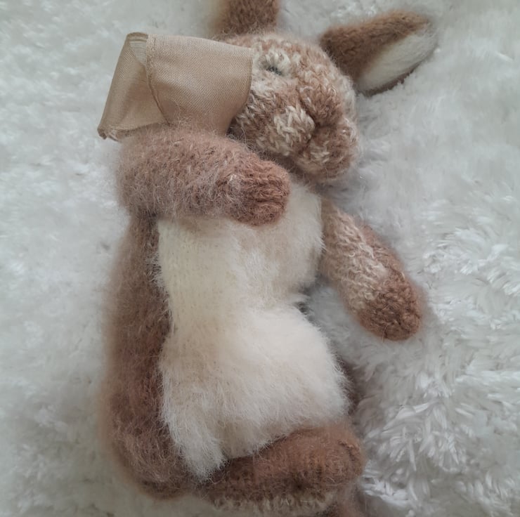 A new little cutie added to my collection. This is my first creation using a new pattern by the talented design artist Claire Garland. The bunny measures 12" (30cm) to the tip of his furry ears. He is made using alpaca yarn and kid mohair with a new type of very soft short fur for his tummy. He is filled with a light as a feather fibre filling for movement which also contains a pouch of pellets for extra squishiness in his fat tummy.