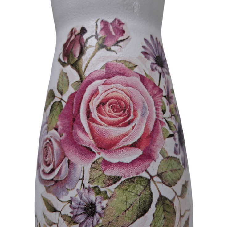 This glass vase has been painted with 2 coats of white paint and Decoupaged with a beautiful floral design napkin. The vase has then been varnished for protection.