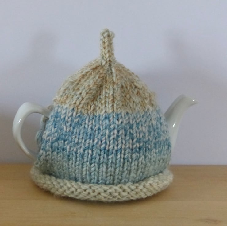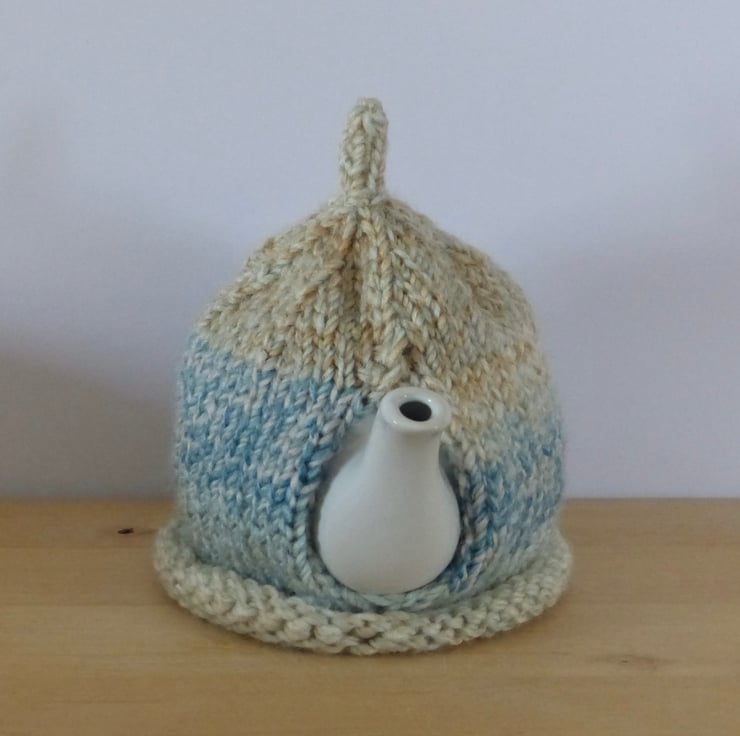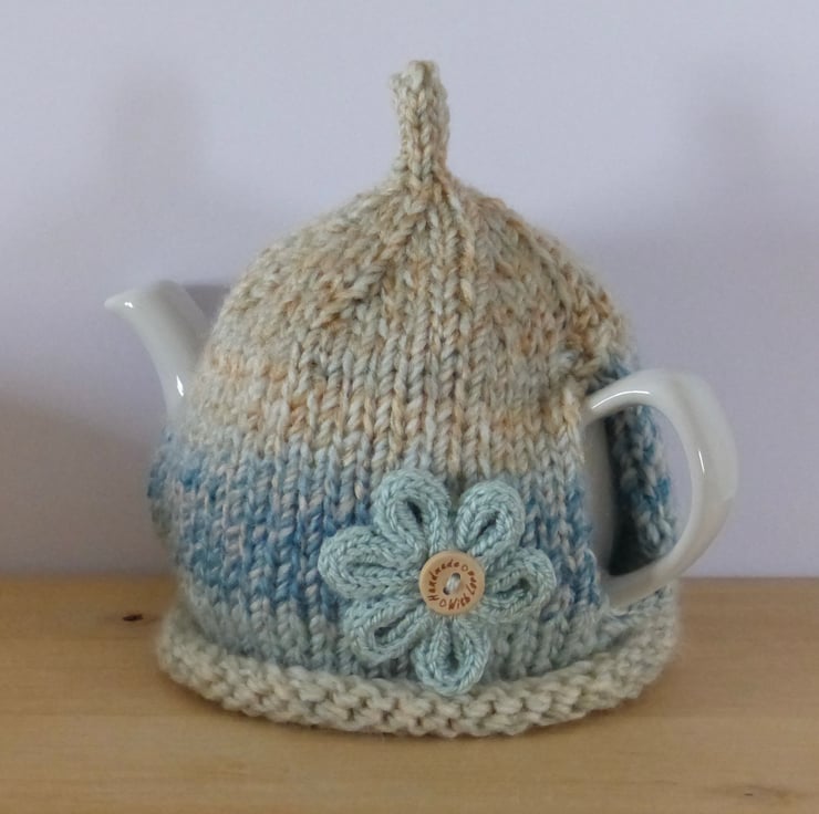 A hand knitted Tea Cosy in a chunky variegated yarn in shades of Aqua Blue, Beige and Off White. It has a 'pixie' top and a french knitted flower, in a Duck Egg coloured yarn, on the front for decoration. the flower has a natural wood button in its centre with the words 'Handmade With Love, on it.