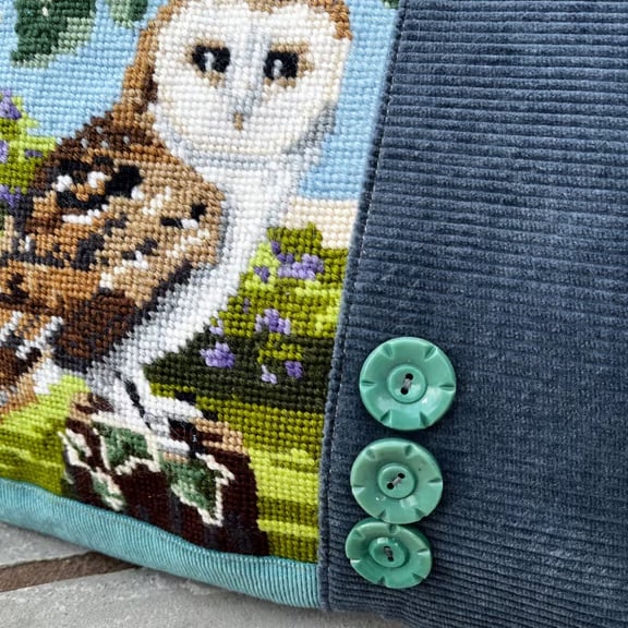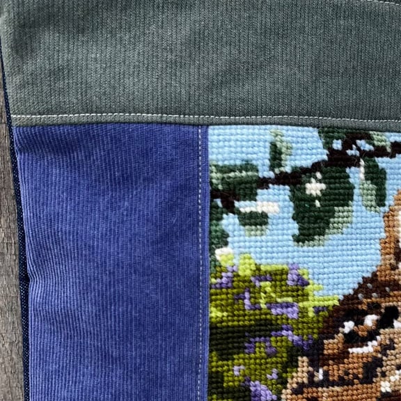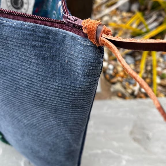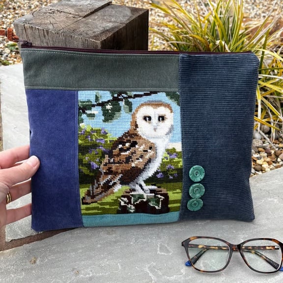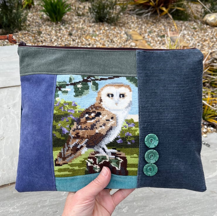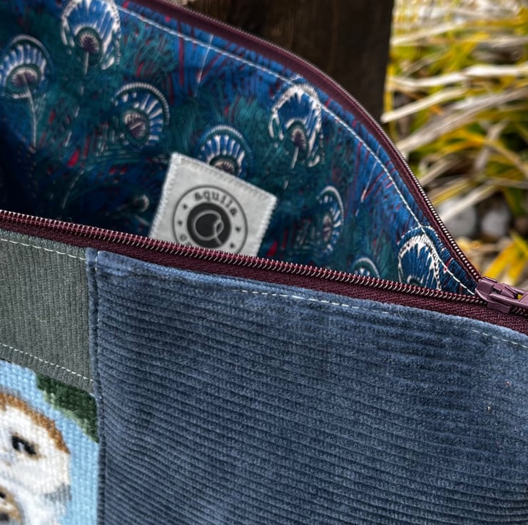 One of a kind large zip pouch made from a repurposed owl tapestry panel. I have combined it with offcuts of needlecord and corduroy fabrics from sample swatches and dark denim for the back. The sample swatches were waste from the fashion industry.