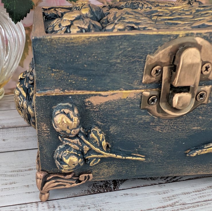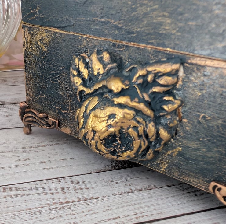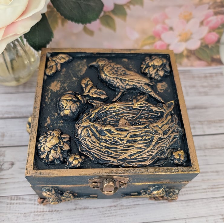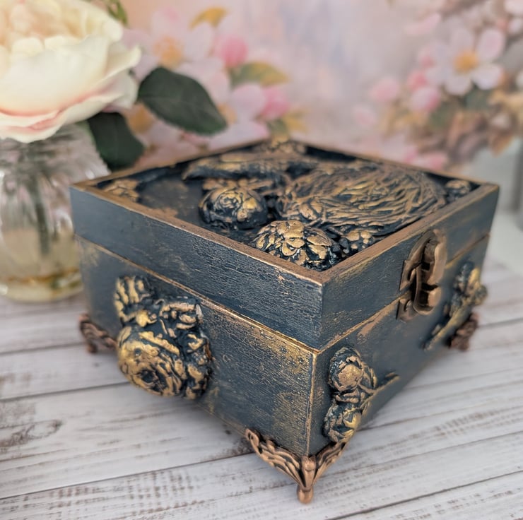 This lovely box has been decorated with air dry clay Bird Roses and a nest and I've simply named this Spring which have been painted in the loveliest colour of Hague Blue and gold Crackles and then highlighted in Gilded Gold. One of a kind. Please note that I have left the inside of the box unlined but painted in the same colours as the outside of the box.