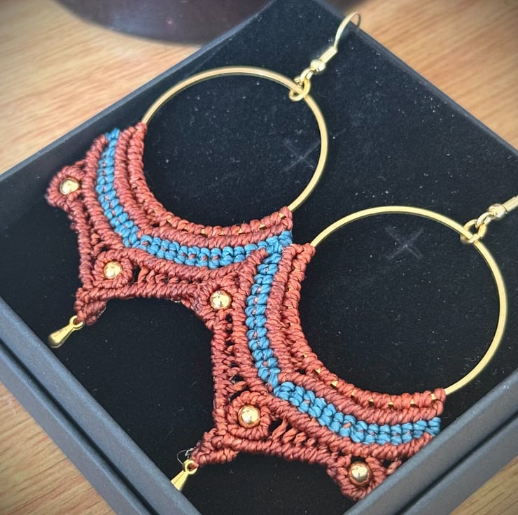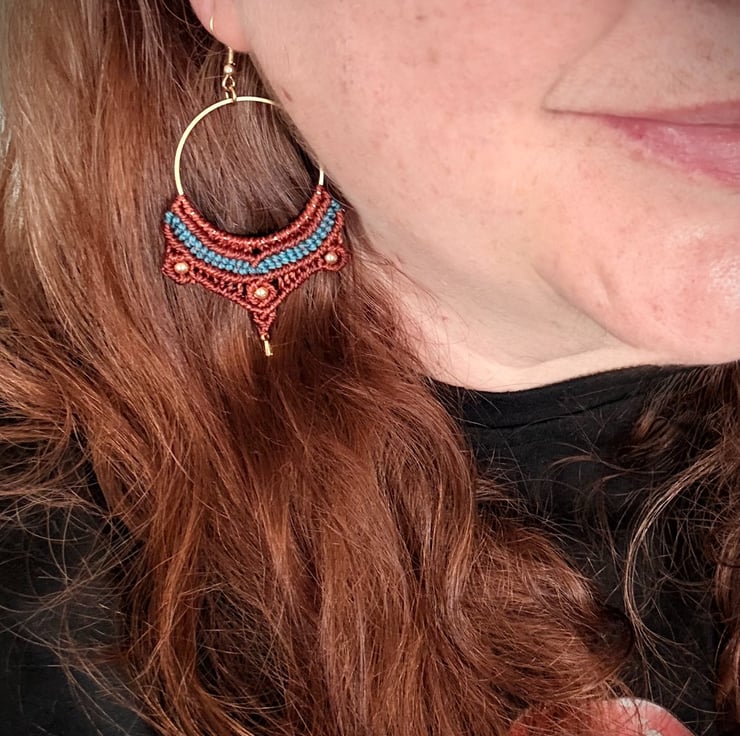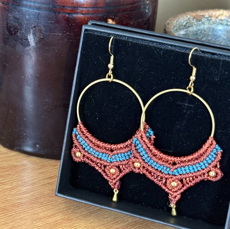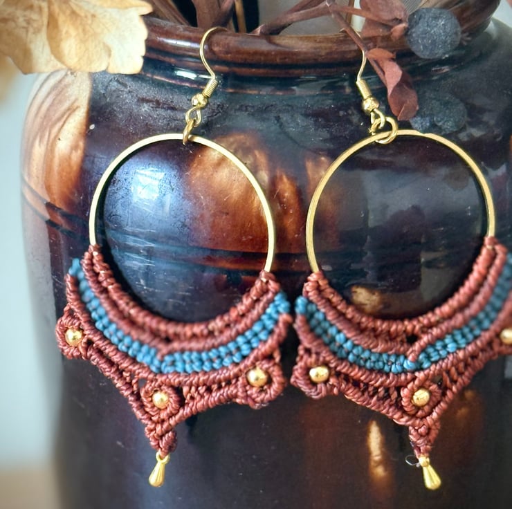 Bohemian handmade micromacrame hoop earrings in a blue and brown design with brass details.