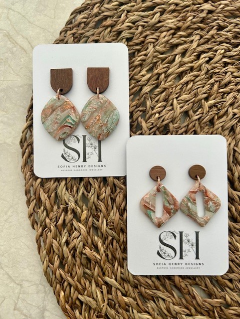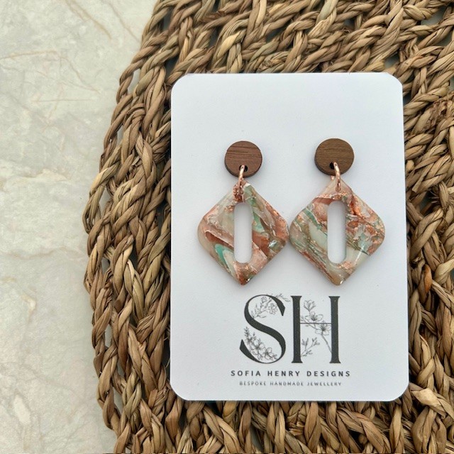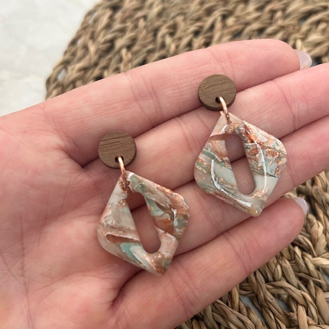 Add a touch of earthy elegance to your jewellery collection with these striking handmade polymer clay earrings, thoughtfully designed with a blend of natural textures and modern elements. Each pair is carefully handcrafted from high-quality polymer clay, featuring a marbled mix of warm terracotta, soft sage green, and creamy neutral tones. Alcohol inks and subtle accents of copper leaf create a beautifully layered effect, giving each piece a unique, organic pattern with a gentle shimmer.