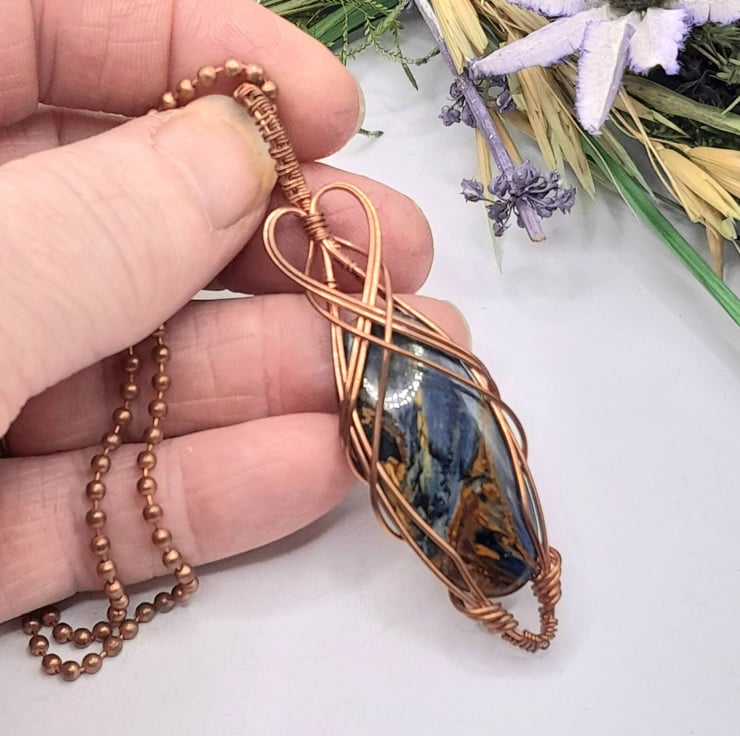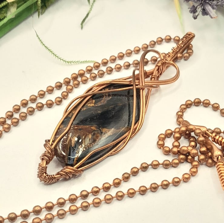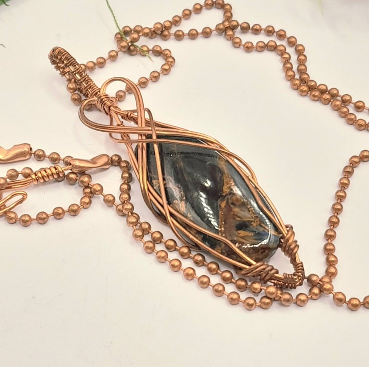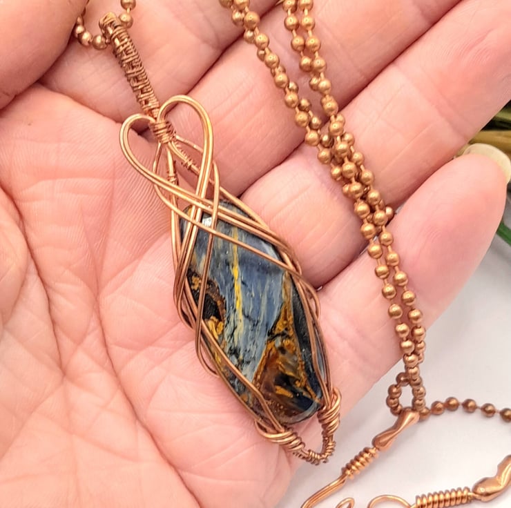 Here we have a beautiful wire wrapped Necklace, made using copper wire that has been wrapped lovingly in a Celtic style around an oblong shaped piece of flashy Pietersite. I have added a simple wire heart as a feature.