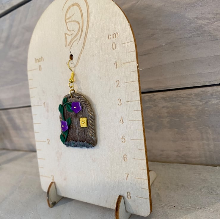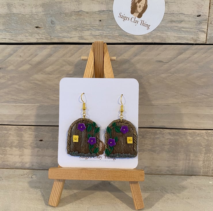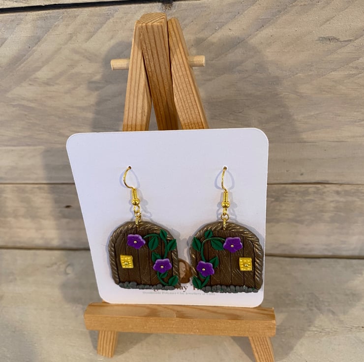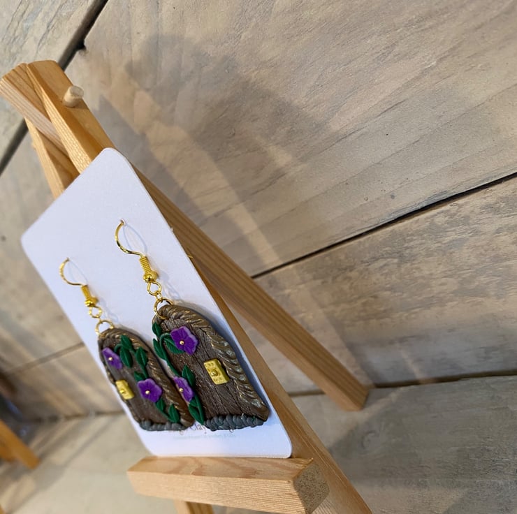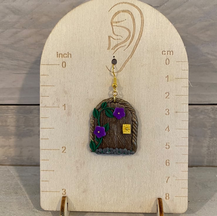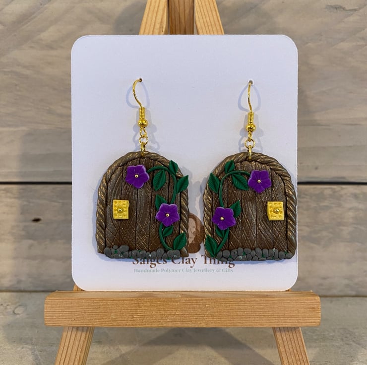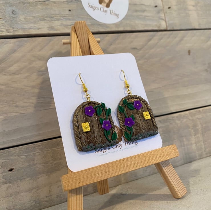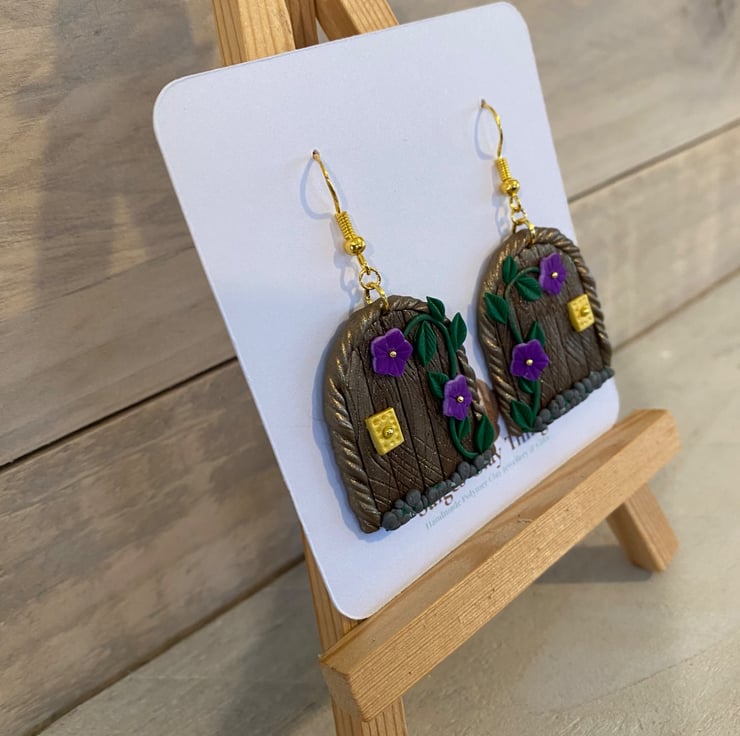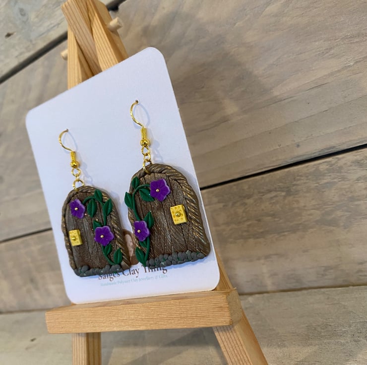 Handmade fairy door earrings crafted from polymer clay, featuring a tiny wooden-style door with purple flowers, leafy vines, stone details, and a gold handle. Perfect for fairy lovers, cottage core style, and whimsical everyday wear.