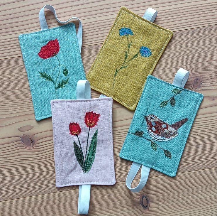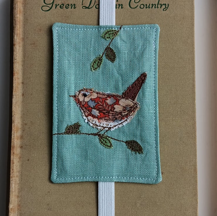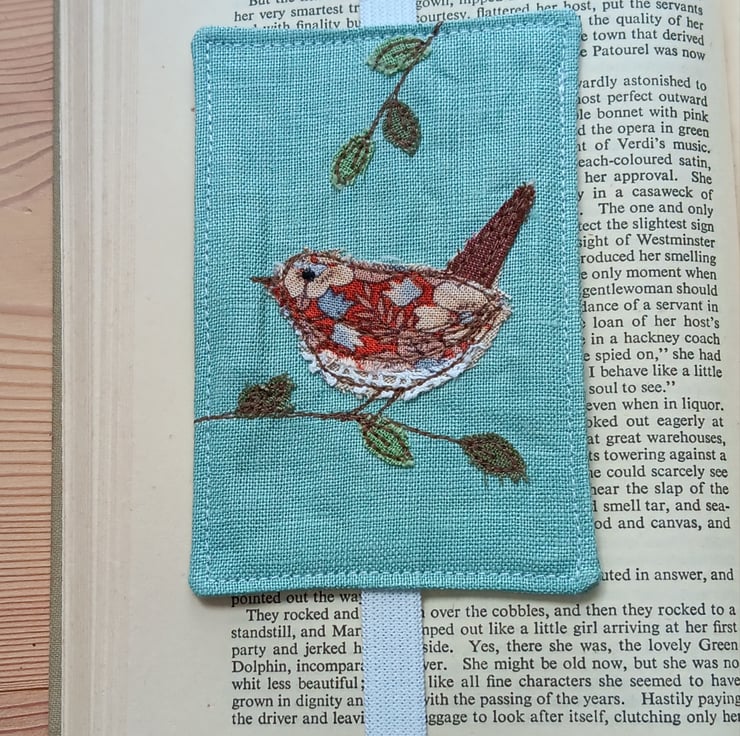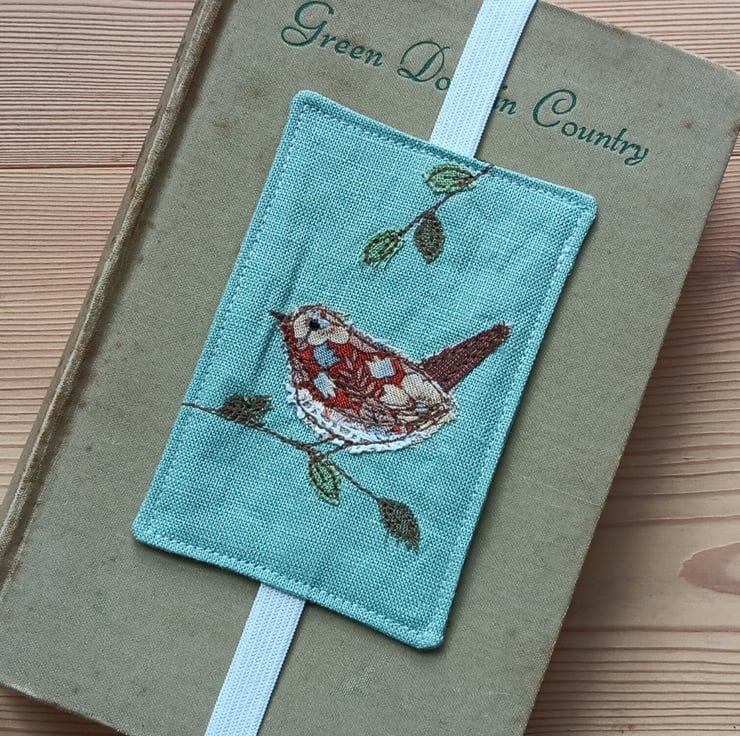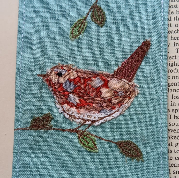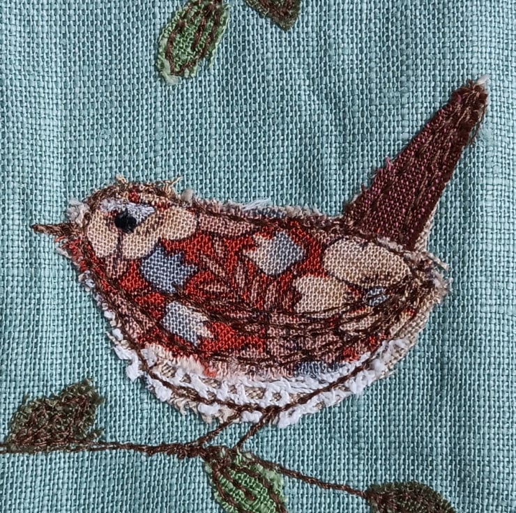 Made from a gorgeous duck egg blue linen, it depicts a little wren perching on a branch. The design is made by appliqueing small scraps of fabric and stitching them using free motion embroidery.
