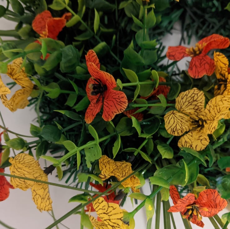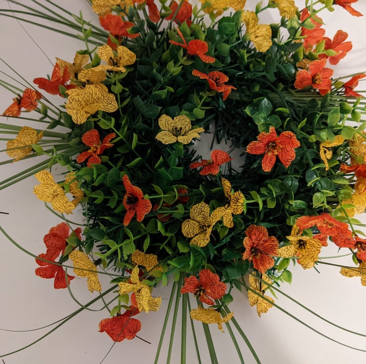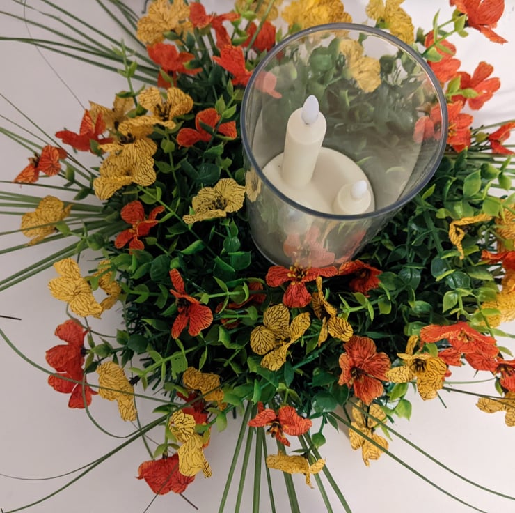 This artificial table centre piece is made using a 20cm wire ring which is dressed with pine or fir, ivy, grass and leaves. Orange and yellow wildflowers are artfully placed in a circle to create a beautiful decoration. The battery candle is also included which can be placed in the centre. Suitable for home decor but would be a beautiful addition to wedding tables. If other colours are required please message me