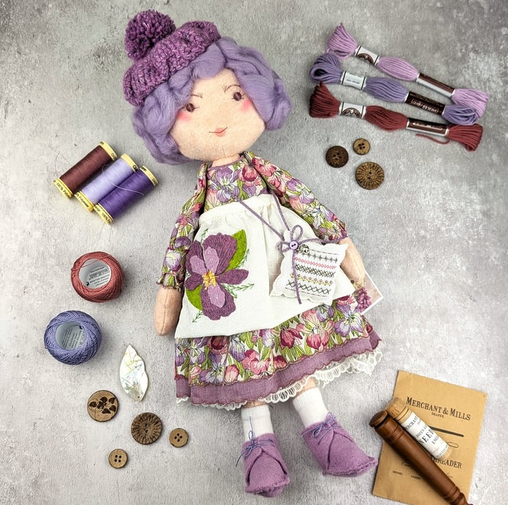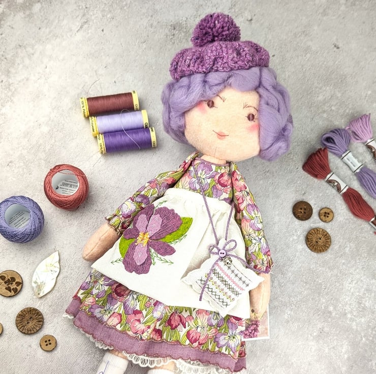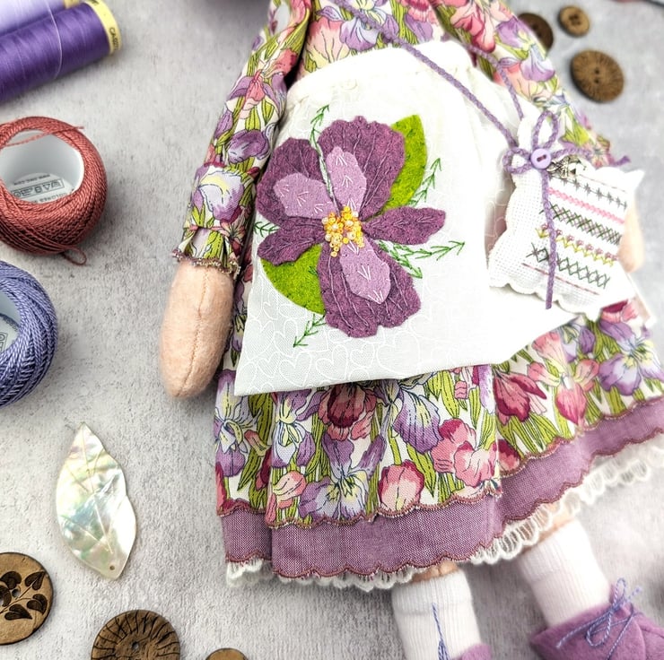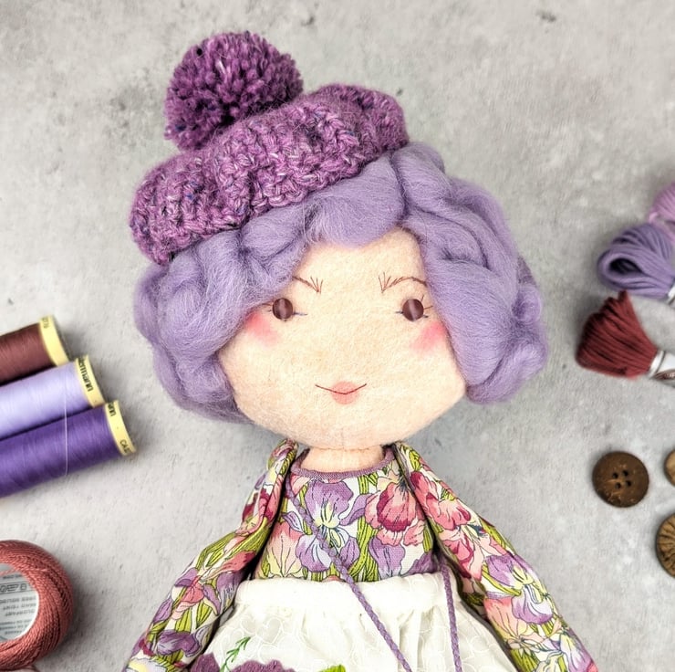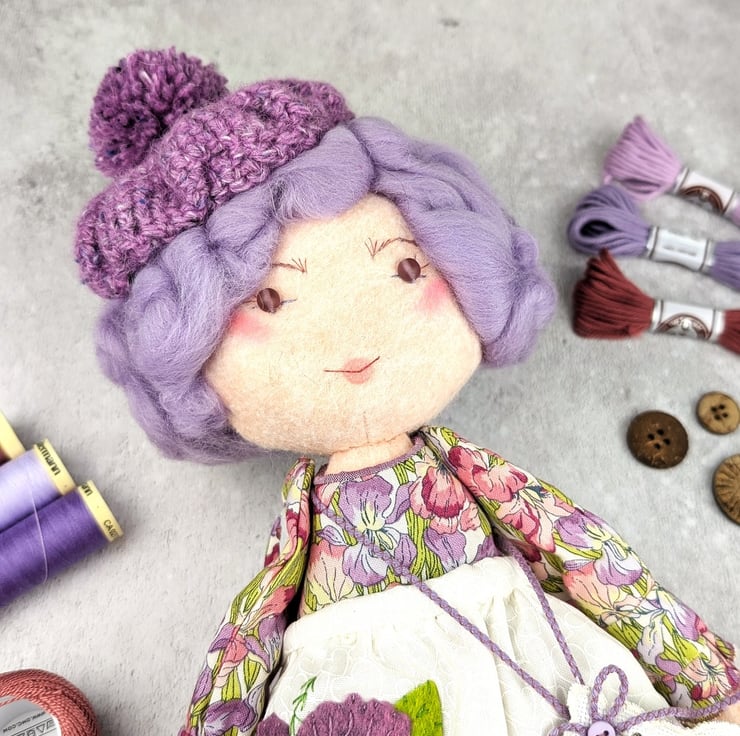 This little doll is Iris. She is made from quality wool felt with frosted glass bead eyes and curly lilac wool roving for hair. Her facial details are hand embroidered and her hair is hand styled. She is dressed in a Liberty print cotton called Iris Muriel and it features lots of iris flowers in shades of pink and purple. Her bobble hat is Tweed Felt Rowan Wool.