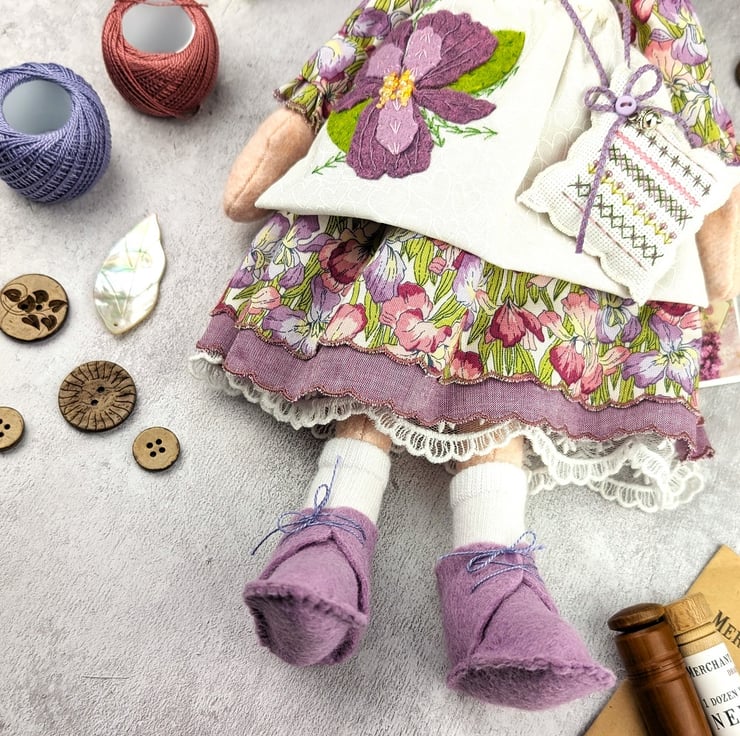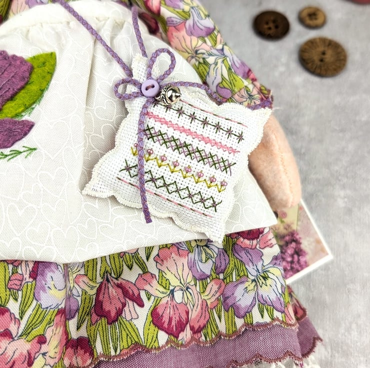 Beneath her dress she has broderie anglais drawers with tiny cotton socks and wool felt boots. Her petticoats are a Lavender cotton chambray with white tulle lace. Her apron is heavily hand embroidered with a folk art pattern of an iris flower symbolizing hope. She is finished with tiny buttons and a sampler pillow.