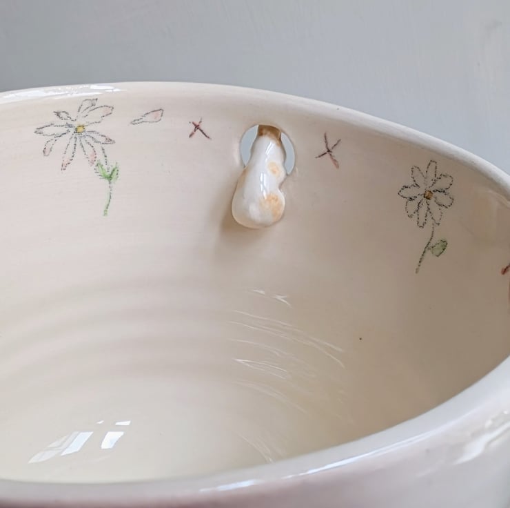 This cup was handthrown on my wheel and the details added. Once bisque fired the bunny, stripes, flowers, hearts were painted and then the piece was clear glazed with food safe lead free glaze before the final firing.