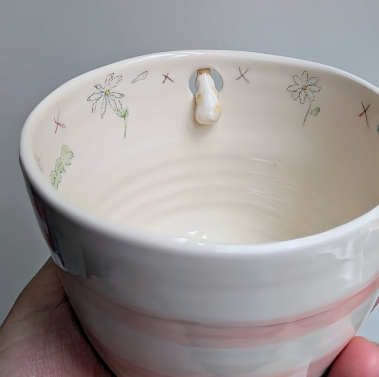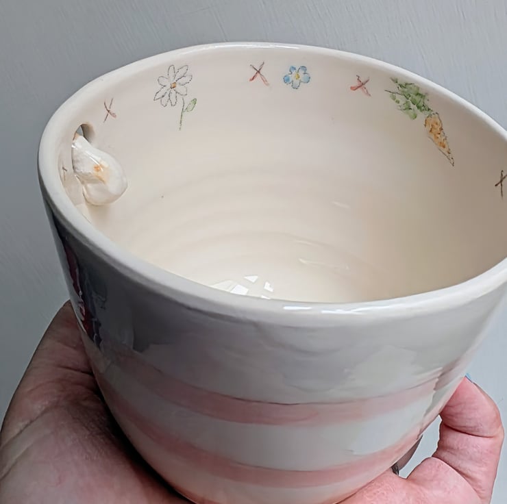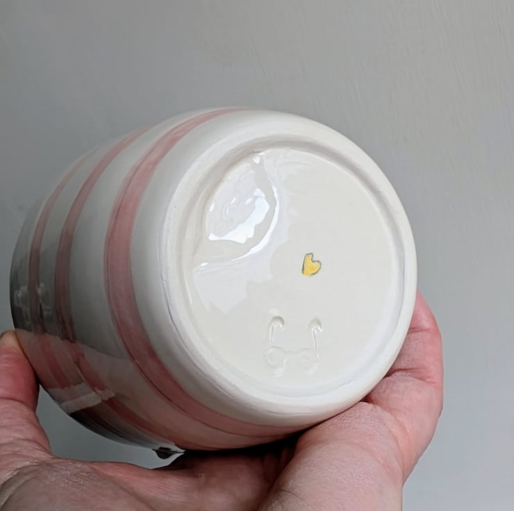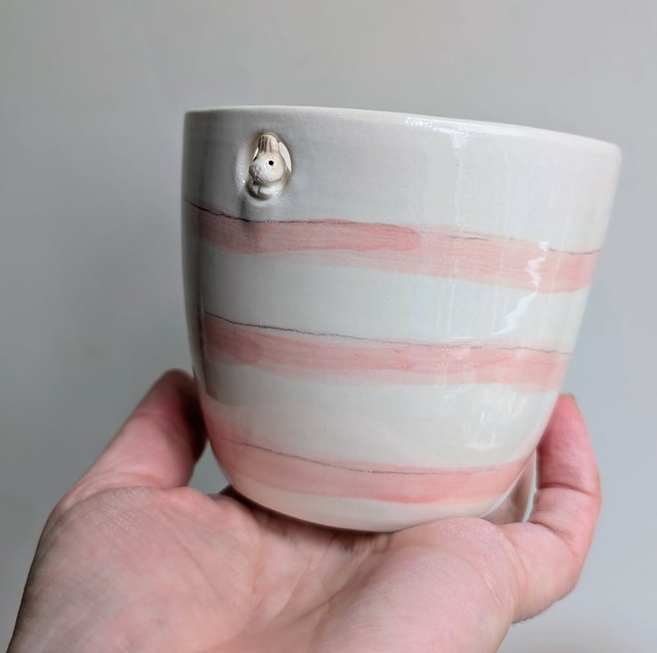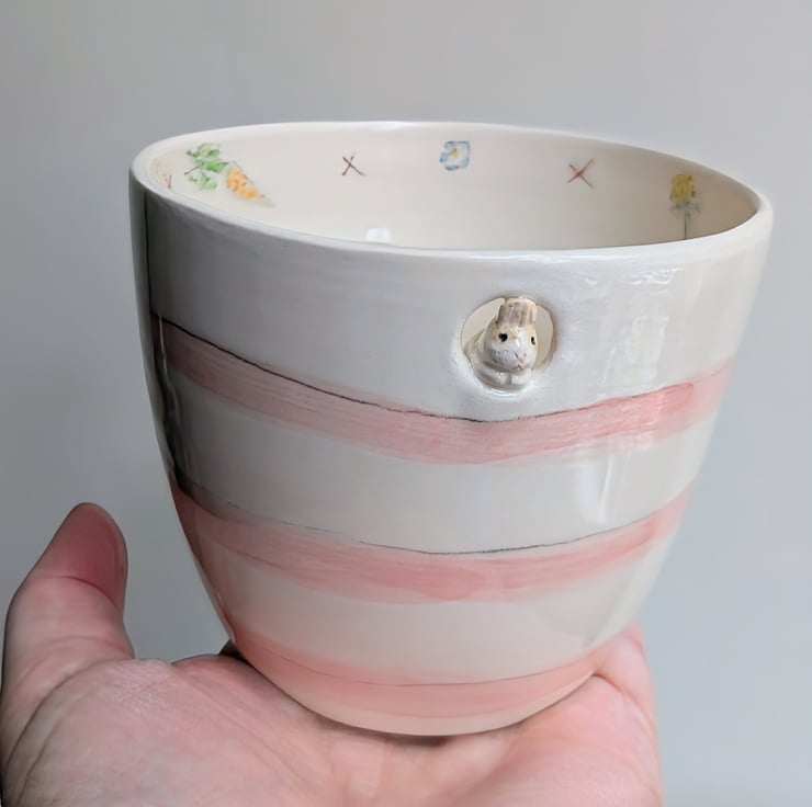 Hand thrown pottery pink striped rabbit tumbler with a tiny hand modelled bunny and hand painted flowers. This piece is on sale as there is a misshapen base (see photo) which does not alter the use or appearance of the cup.