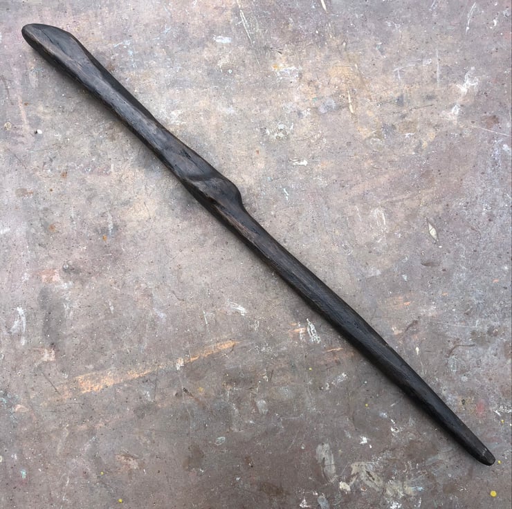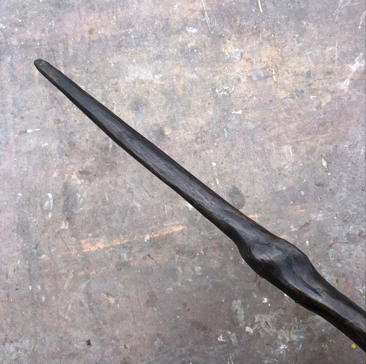 Scarred, big-knuckled, thumb-grooved wand from wood that is around five thousand years old.