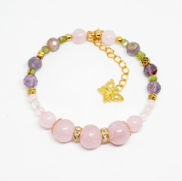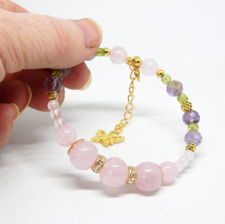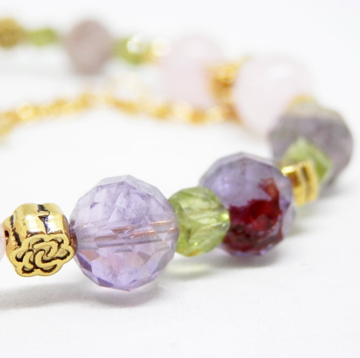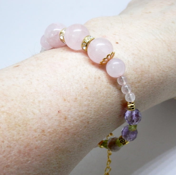Here we have a beautiful Memory Wire Bracelet made using gold plated Memory Wire that holds it's shape. Adorned with an assortment of differently sized Rose Quartz beads, faceted Amethyst beads, little Peridot beads and gold plated and diamante spacers.