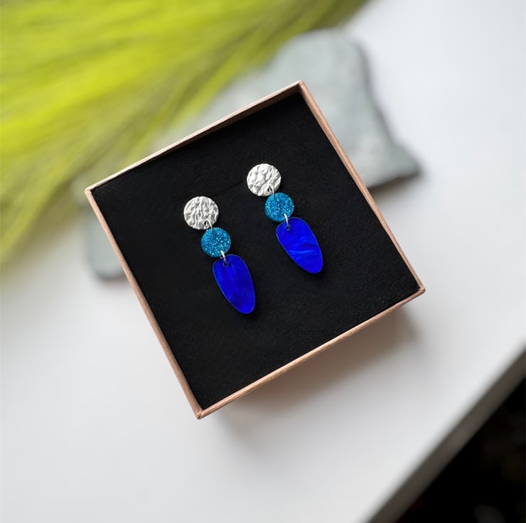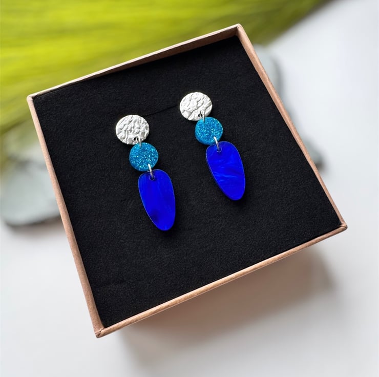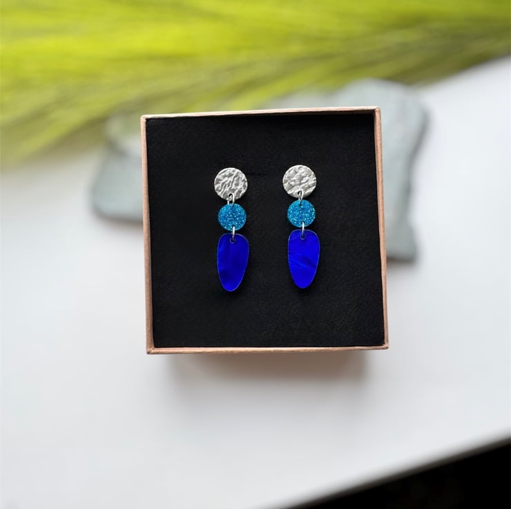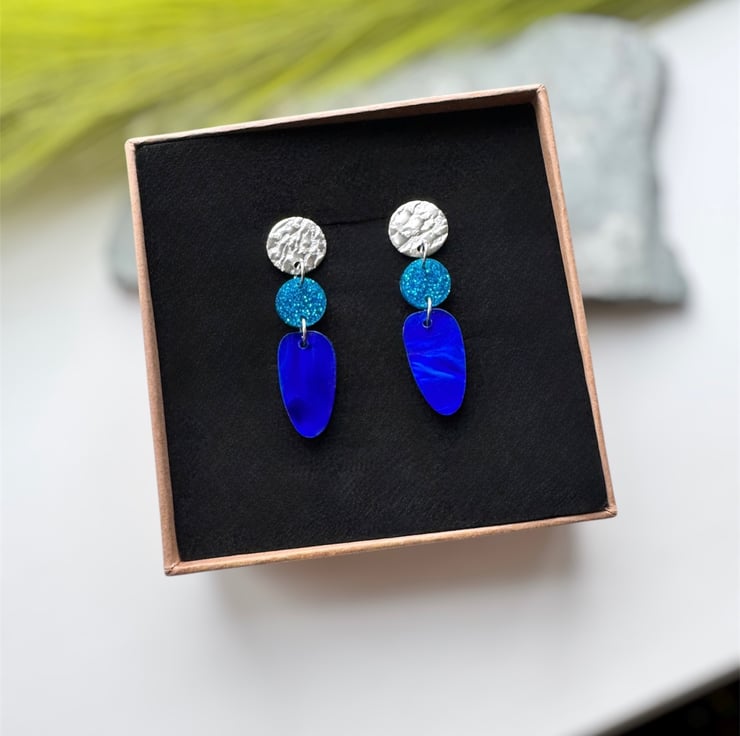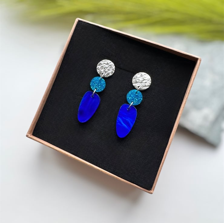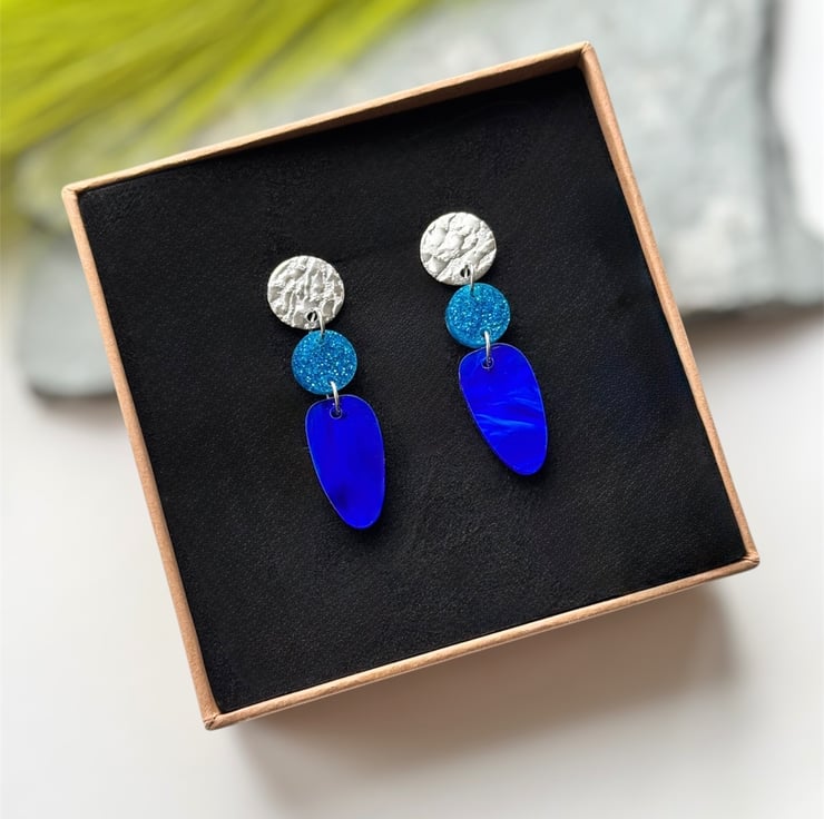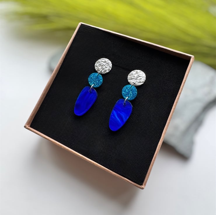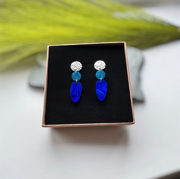 A smaller circle of blue glitter acrylic and an organic oval drop of deep swirling marble blue acrylic.