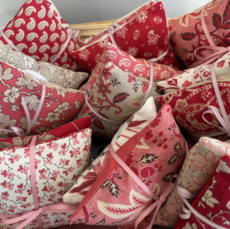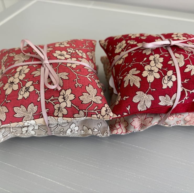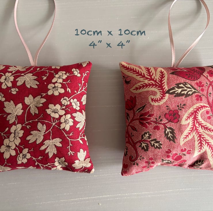 This listing is for two fragrant organic Provençal lavender bags made with a selection of fabrics from the 'Rouenneries Trois' collection from French General in 100% Cotton. The sachets are filled with organic lavender grown in the Provençal region of France. Each bag has a different front and back in co-ordinating colours red, coral, beige and pink. They have a hand-sewn closure for neatness. The bags measure 10cm x 10cm (4"x4").