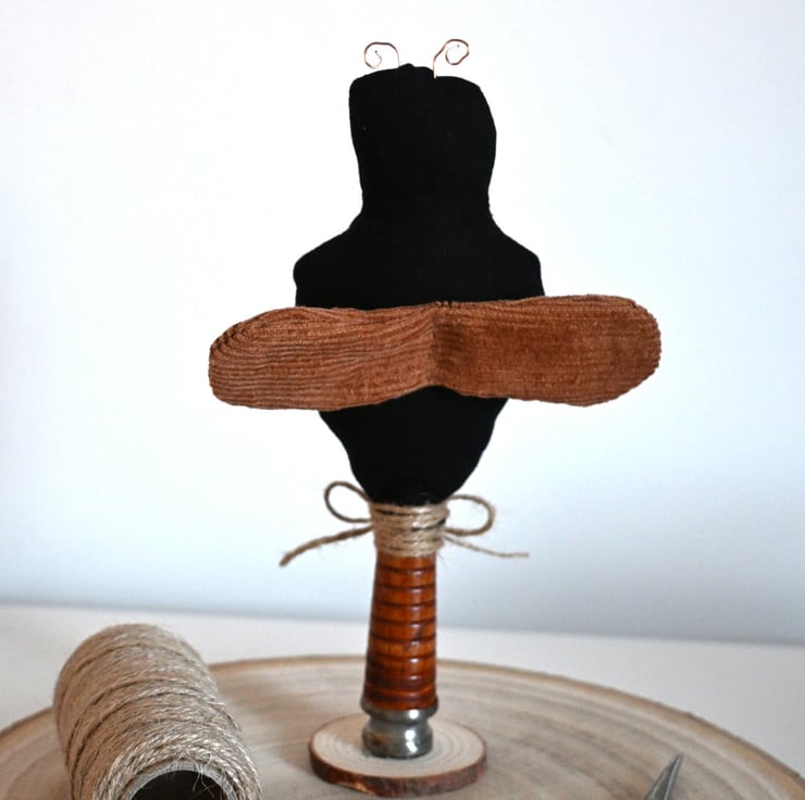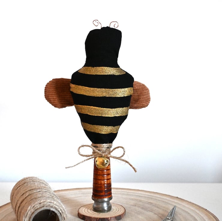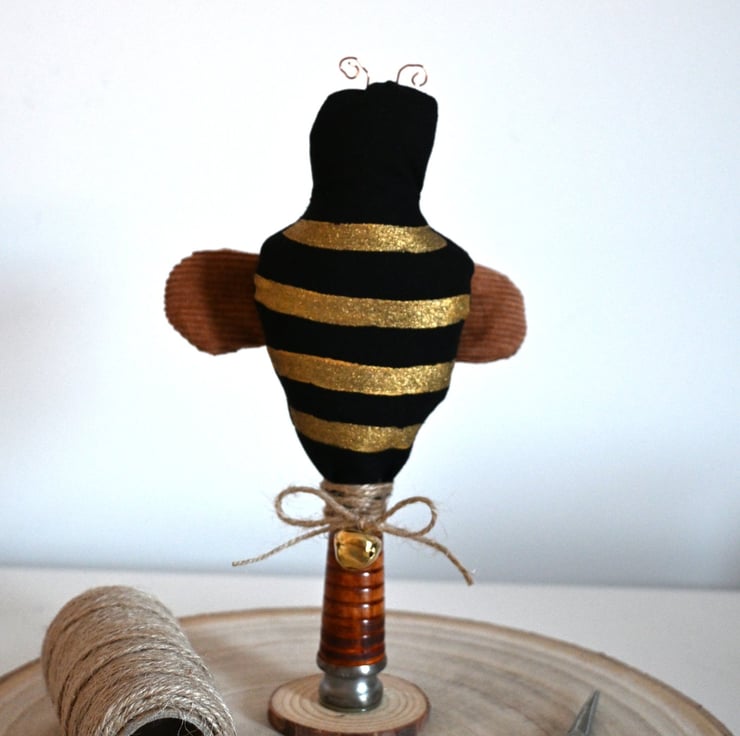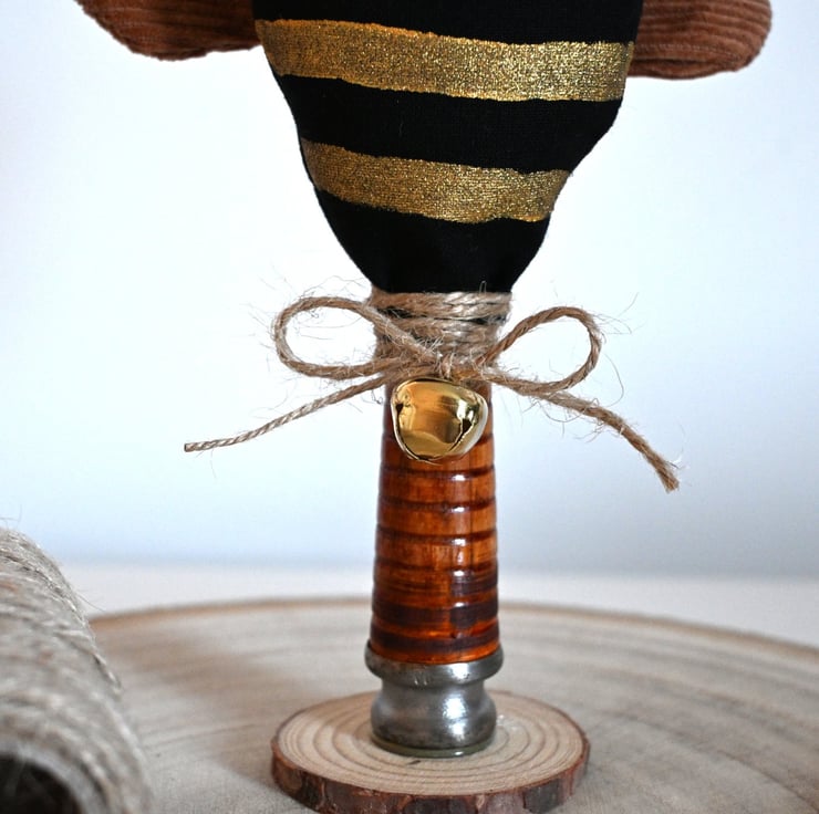 The bee stands on a repurposed bobbin and has a twine tied in a bow and a little brass bell.